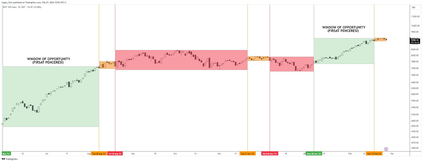 Örnek olarak #Borsaistanbul #XU100 endeksini nasıl takip ettiğimi göstereyim. Grafikte görebileceğiniz kendi teknik kriterlerimle oluşturduğum sisteme göre 8 Ocak 2024 tarihinde açılan "Fırsat Penceresi (Yeşil Alan)", benim kriterlerime göre 19 Şubat 2024 günü "Orta Riskli (Turuncu Bölge)" ortama dönüştü. Bugünkü kapanışa göre de ya Turuncu bölgede kalmaya devam edeceğiz ya da "Riskli Ortama" geçiş yapacağız. Turuncu bir değişim veya dinlenme bölgesidir. Bakalım fırsat penceremiz açık kalmaya devam mı edecek yoksa şimdilik kapanacak mı?