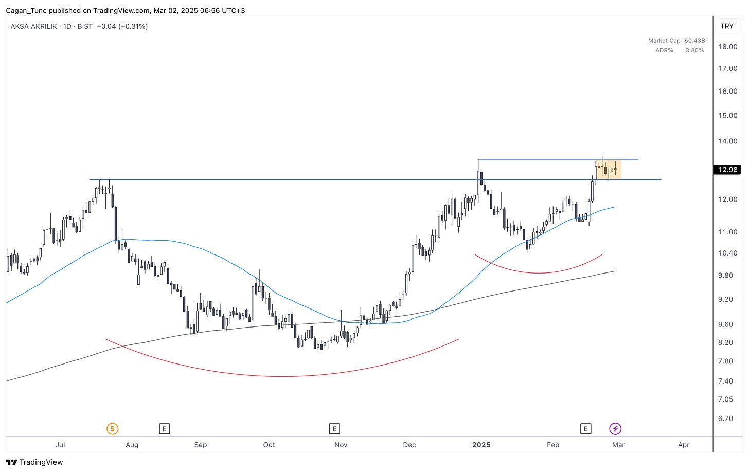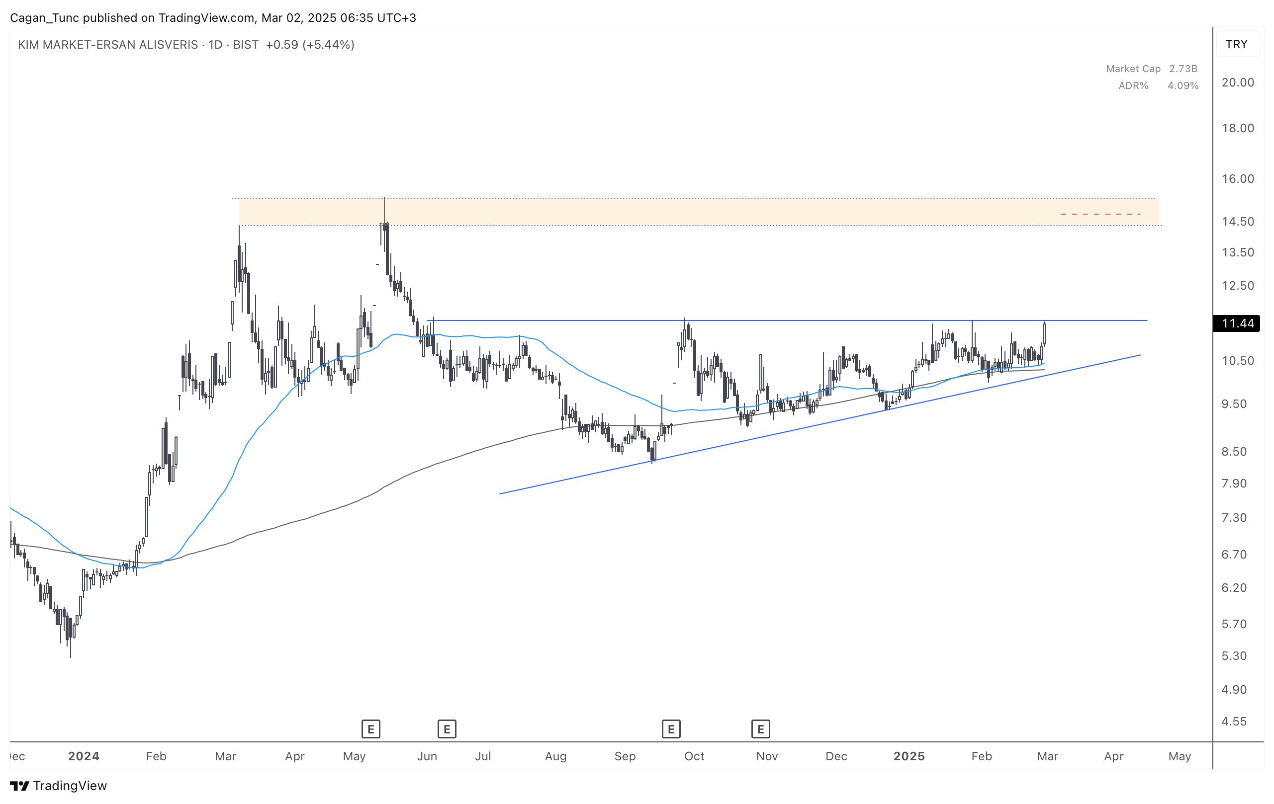 Borsa İstanbul’da kademeleri dolu olmayan ve geçmişte yüksek volatilite ile hareket eden hisse senetlerini trade etmeyi çok sevmediğimi biliyorsunuz. Eli hızlı olup, riski yönetebilecek olanlar hisse senedi grafiğinde net bir yükselen üçgen formasyonu görebilir. 15-TL formasyon hedefi aynı zamanda teknik direnç zonunun da olduğu bölgeye geliyor.
