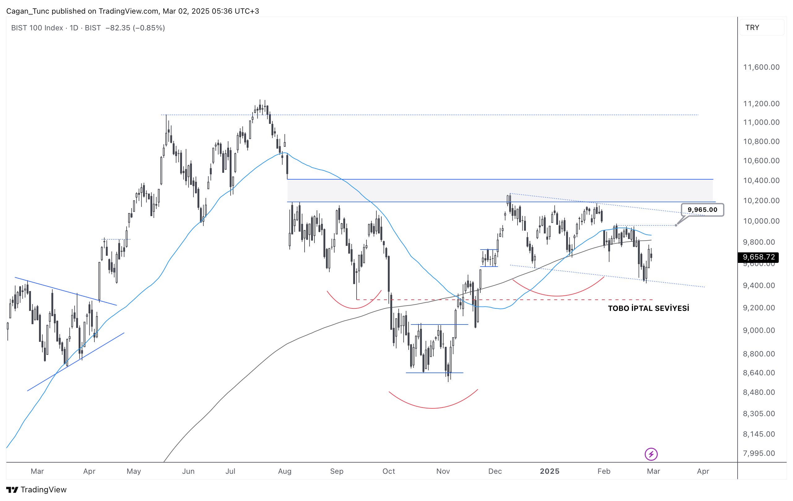 Yeni haftaya başlarken öncelikle kısa bir #XU100 endeks grafiği değerlendirmesi yapalım. Biliyorsunuz, uzun zamandır endekste herkesin takip ettiği bir TOBO görüntüsü var. Son zamanlarda sağ omuz simetrisinin bozulmasından dolayı her ne kadar bazıları TOBO’nun iptal olduğunu söylese de klasik teknik analiz bakış açısında chart formasyonlarının asimetrik ve kompleks yapıda da karşımıza çıkabileceğini ve bunların birçok örneği olduğunu biliyoruz. Grafikte TOBO’nun iptal olacağı seviyeyi gösterdim: 9275. Bugün için risk-off modunun devam ettiği #Borsaistanbul #XU100 endeksinde fiyat, bir süredir kısa vadeli düşük eğimli bir alçalan kanal içerisinde hareket ediyor. Her ne kadar Çarşamba ve Perşembe günleri gelen alımlar fiyatı, 50 ve 250 günlük ortalamaların birleştiği bölgeye taşımış olsa da ortalamalar fiyatı ezmeye devam ediyor. Endekste yukarı yönlü bir hareketten bahsedebilmemiz için fiyatın öncelikle ortalamaların üzerine yerleşmesi ve önceki tepe çevresinde oluşan direnç bölgesinin (9965 seviyesi) üzerine geçmesi gerekiyor. Aşağı yönlü hareketlerde ise destek seviyesi olarak kanal alt bandı takip edilebilir...