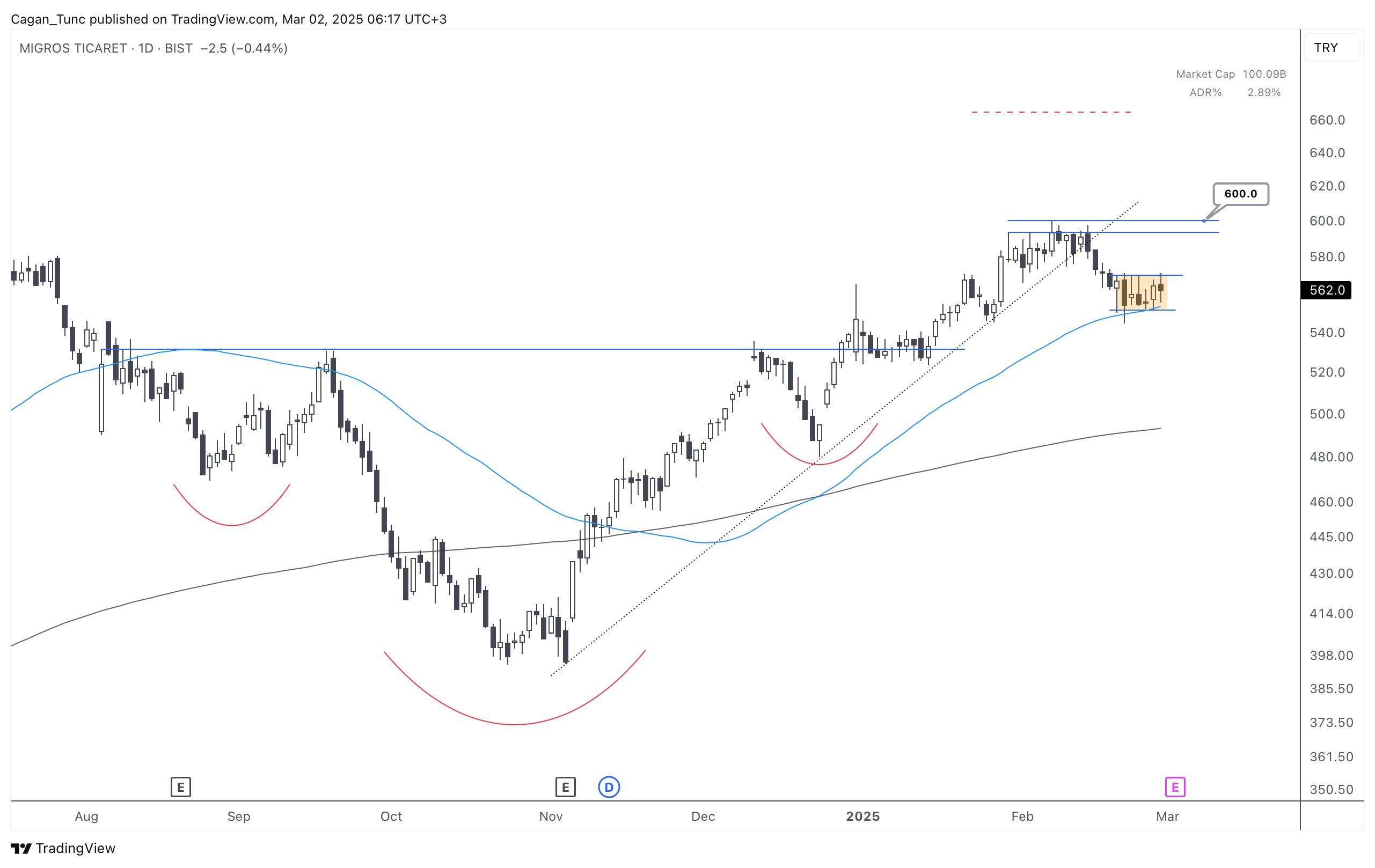 Bu hisse senedinde teknik görüntü oldukça net. Güçlü bir yükseliş trendi sonrası 50 günlük ortalamanın tam üzerine oturarak dinlenen fiyat, turuncu ile gösterdiğim bölgenin üzerine çıkabilirse daha önce bir kaç kez direnç görevi gören 600-TL seviyesine doğru bir hareket gelebilir. Bu bölgede gerçekleşecek fiyat hareketleri hisse senedinin orta vadeli asıl yönünü belirleyecektir. Turuncu bölgenin altına sarkmalarda ise uzun dönem ortalama mıknatıs etkisi ile fiyatı kendine doğru çekecektir.