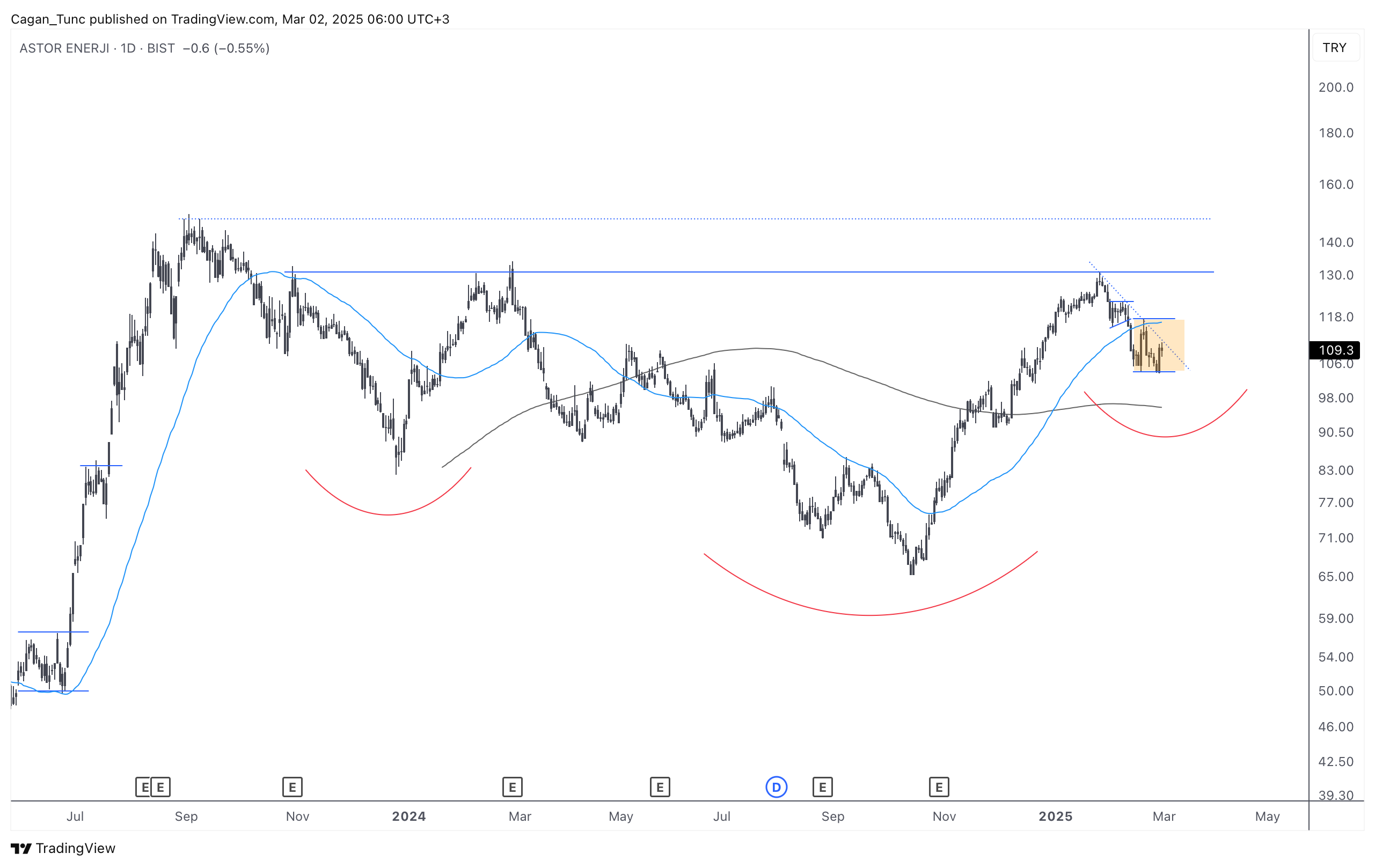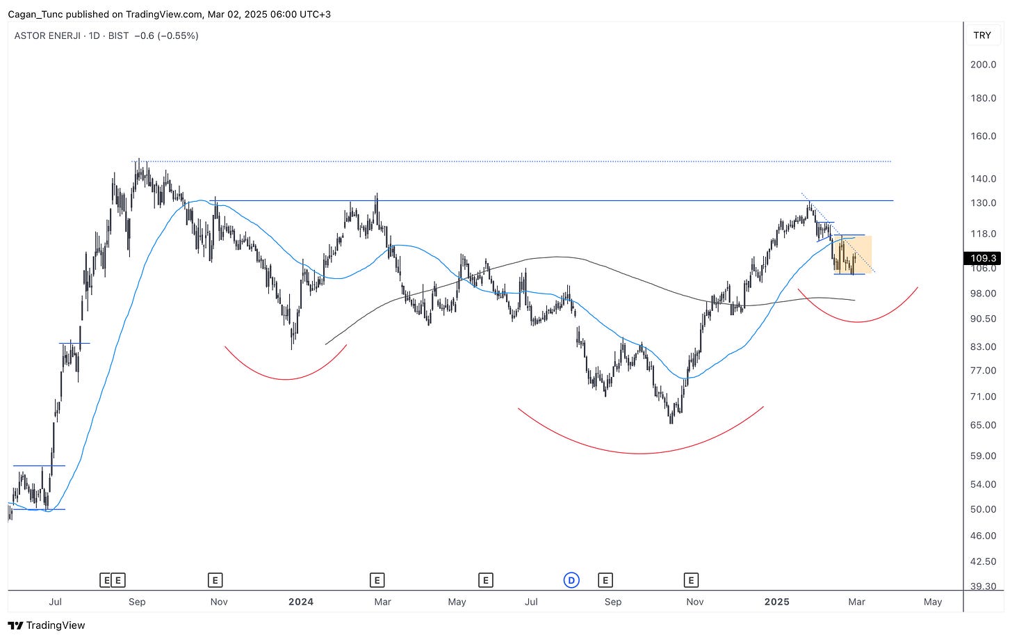 Büyük resimde bir TOBO görüntüsü sunan bu hisse senedi grafiğinde olası bir sağ omuz oluşumu takip ediyorum. Güçlü yükseliş sonrası doğal düzeltme sürecinde kısa vadeli bir düşüş trendine giren bu hissede turuncu ile gösterdiğim bölgenin yukarı yönlü kırılımı ve fiyatın 50 günlük ortalamanın üzerine yerleşmesi ile hisse yeniden momentum kazananilir. Tersi senaryoda ise 104 seviyesi ilk destek olarak karşımıza çıkıyor. Bu seviyenin aşağı kırılımı kısa vadeli düşüş trendinin devamı anlamına gelecektir.
