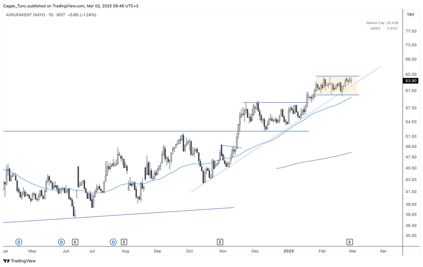 Uzun süredir endekse görece güçlü hareket eden hisse senedi bir süredir konsolide olarak bir dikdörtgen formasyonu oluşturdu. Fiyat bu konsolidasyon bölgesini yukarı kırabilirse bir boy yükseliş daha izleyebiliriz. Yükselen trend çizgisini net olarak takip edebildiğimiz hisse senedi için bu trend çizgisinin aşağı kırılımı olumsuz bir fiyatlama başlatabilir.