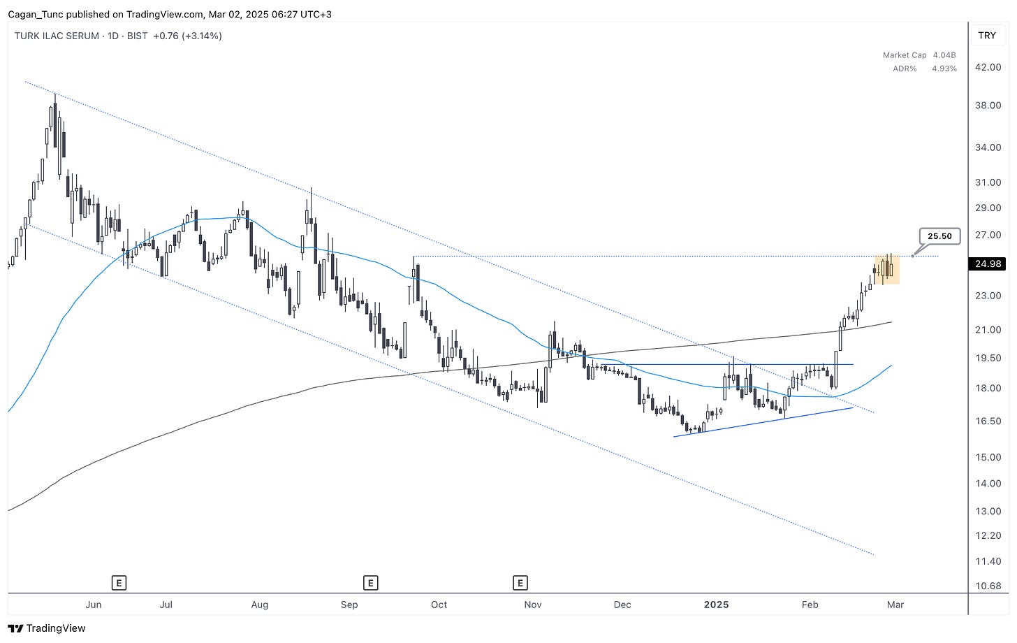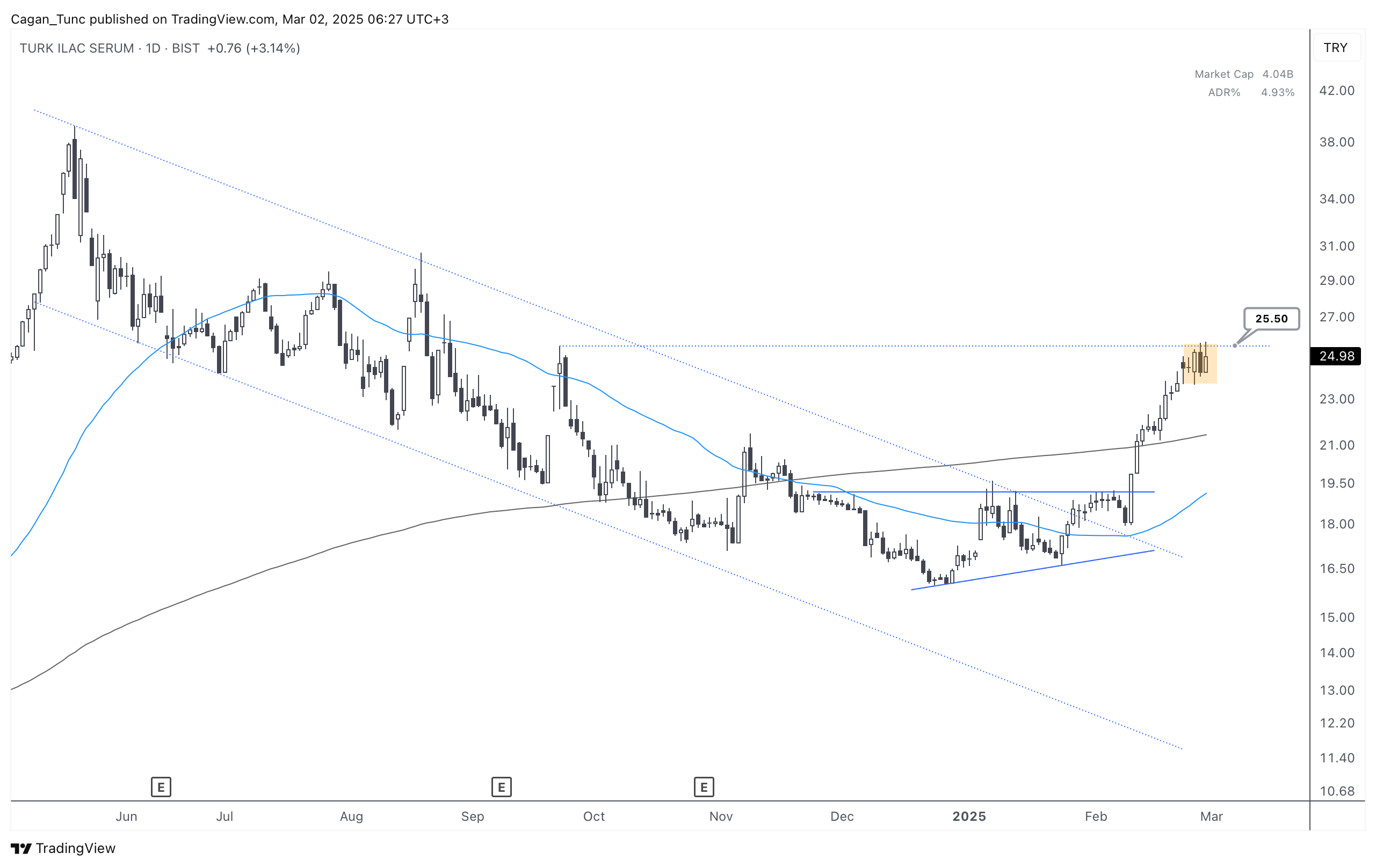 Uzun süredir düşen kanal içerisinde hareket eden fiyat dipte yaptığı yükselen üçgen dönüş formasyonu ile güçlü bir çıkış yakaladı. Fiyat-hacim ilişkisi oldukça olumlu görünen hisse senedi bugün için yukarı yönlü momentumunu koruyor. 25.50 seviyesinde doğal bir teknik dirençle karşılaşan hisse senedi turuncu ile gösterdiğim bölgeyi yukarı kırabilirse yeni bir hareket başlatabilir.