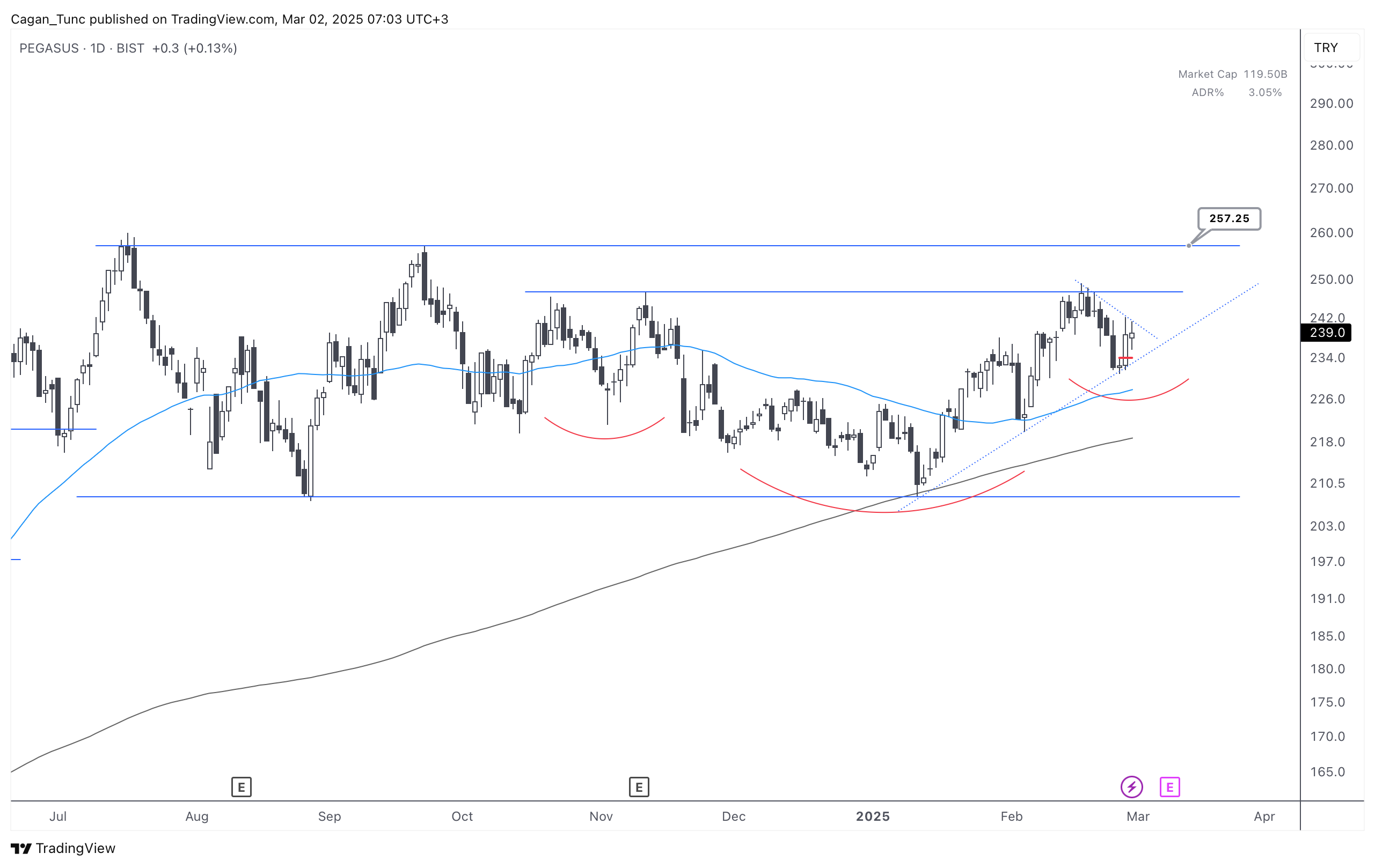 Büyük resimde önemli bir dikdörtgen formasyonu takip ettiğim bu hisse senedi bir süredir endekse görece güçlü hareket etmeye başladı. Dipten kısa dönemli bir yükseliş trendi başlatan hisse senedine 27 Şubat mumuyla düşük miktarda giriş yaptım. Ancak asıl hareketin 248-TL ve sonrasında 257-TL dirençlerinin geçilmesi ile başlayacağını düşünüyorum. Özellikle uzun dönemli dikdörtgen formasyonunun üst sınırı 257-TL’nin yukarı kırılımı hisse senedi için yeni bir oyun alanı açacaktır. Aksi senaryoda ise kısa vadeli yükseliş trendinin aşağı kırılımı olumlu görüntüyü tersine çevirebilir.