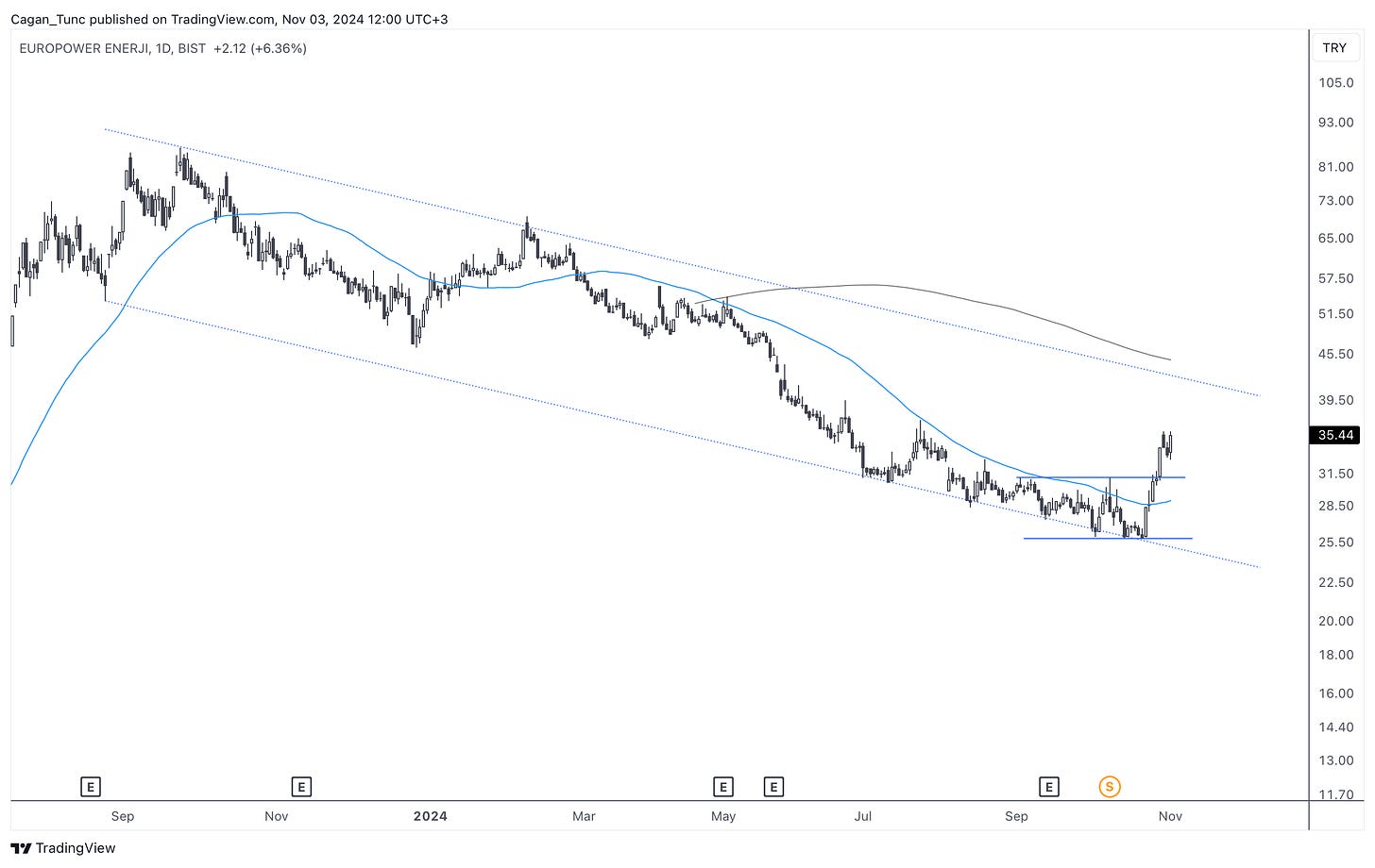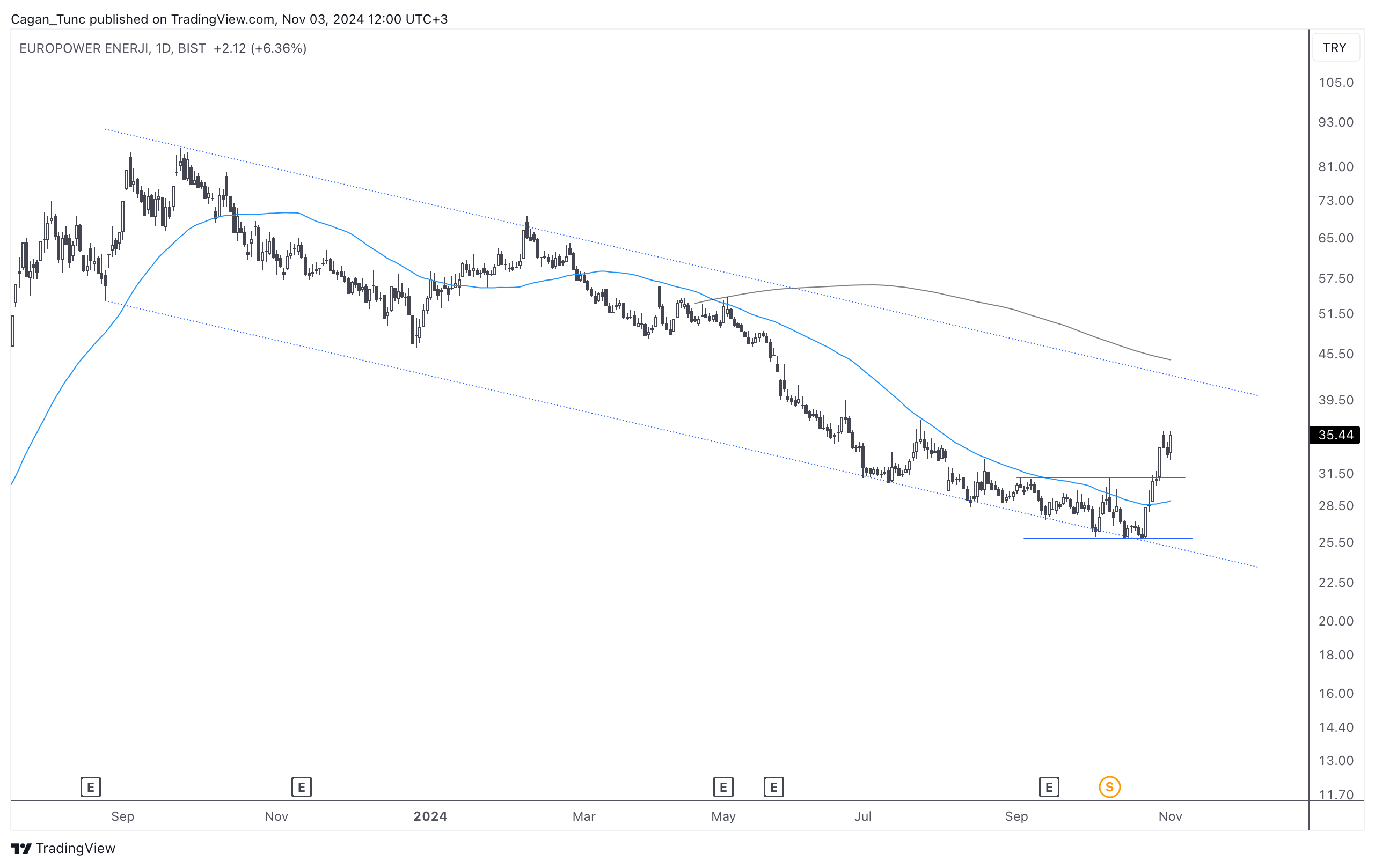 #EUPWR - Uzun süredir düşüş kanalı içerisinde hareket eden bu hisse senedi kanal alt bandından net bir dönüş gerçekleştirdi. 50 günlük ortalama üzerine yerleşen fiyat uzun dönem ortalamanında bulunduğu kanal üst bandına doğru hareketini sürdürebilir.