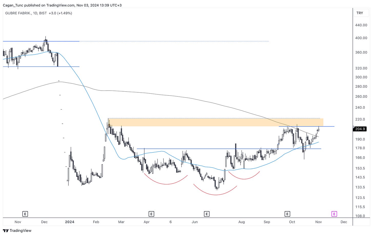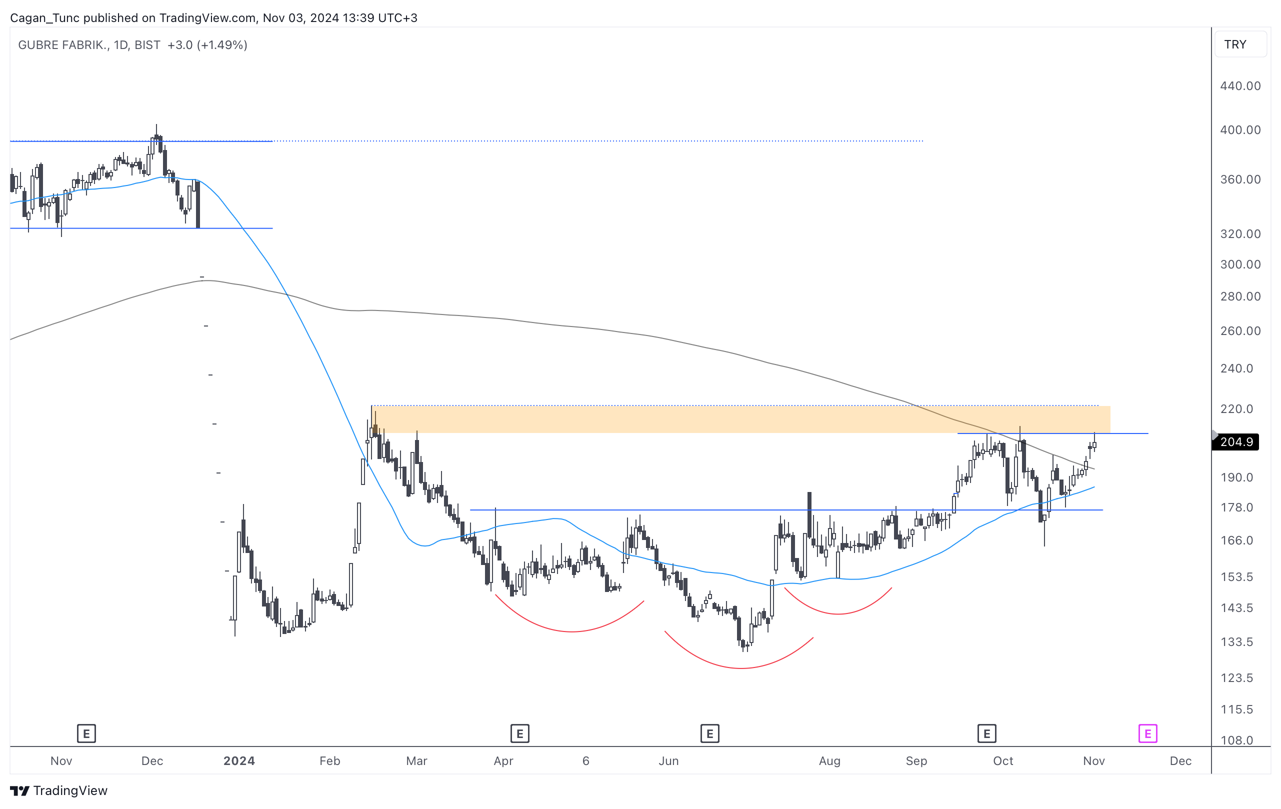 #GUBRF - Düzeltme dönemini dipten dönüş çabasıyla geçiren bu hisse senedi için turuncu ile belirttiğim direnç bölgesinin geçilmesi yeni bir oyun alanı açabilir.