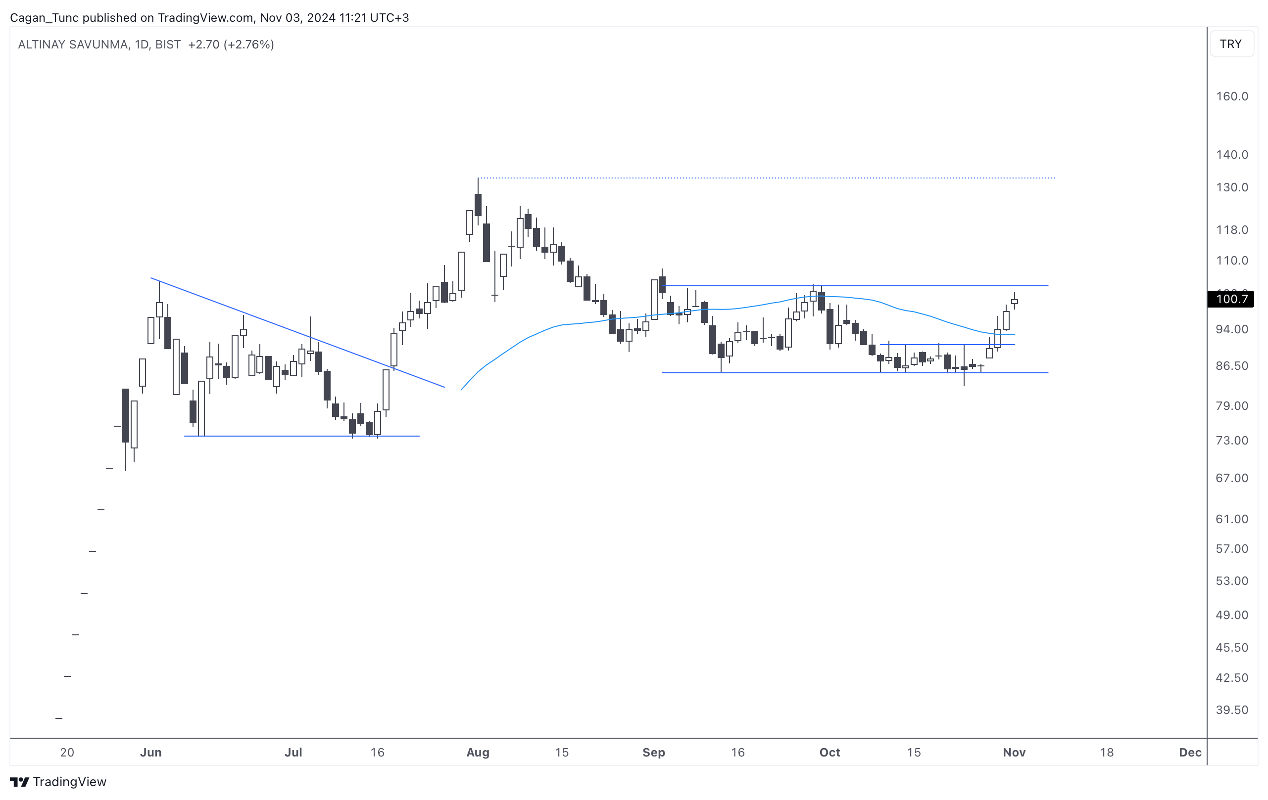 #ALTNY - Son dönemde endekse göre göreceli olarak iyi performans sergeleyen bu hisse senedi grafiğinde oluşan yatay konsolidasyonu takip ediyorum. Fiyat bu bölgeden güçlü çıkabilirse gördüğü zirveyi tekrar test etmek isteyebilir.