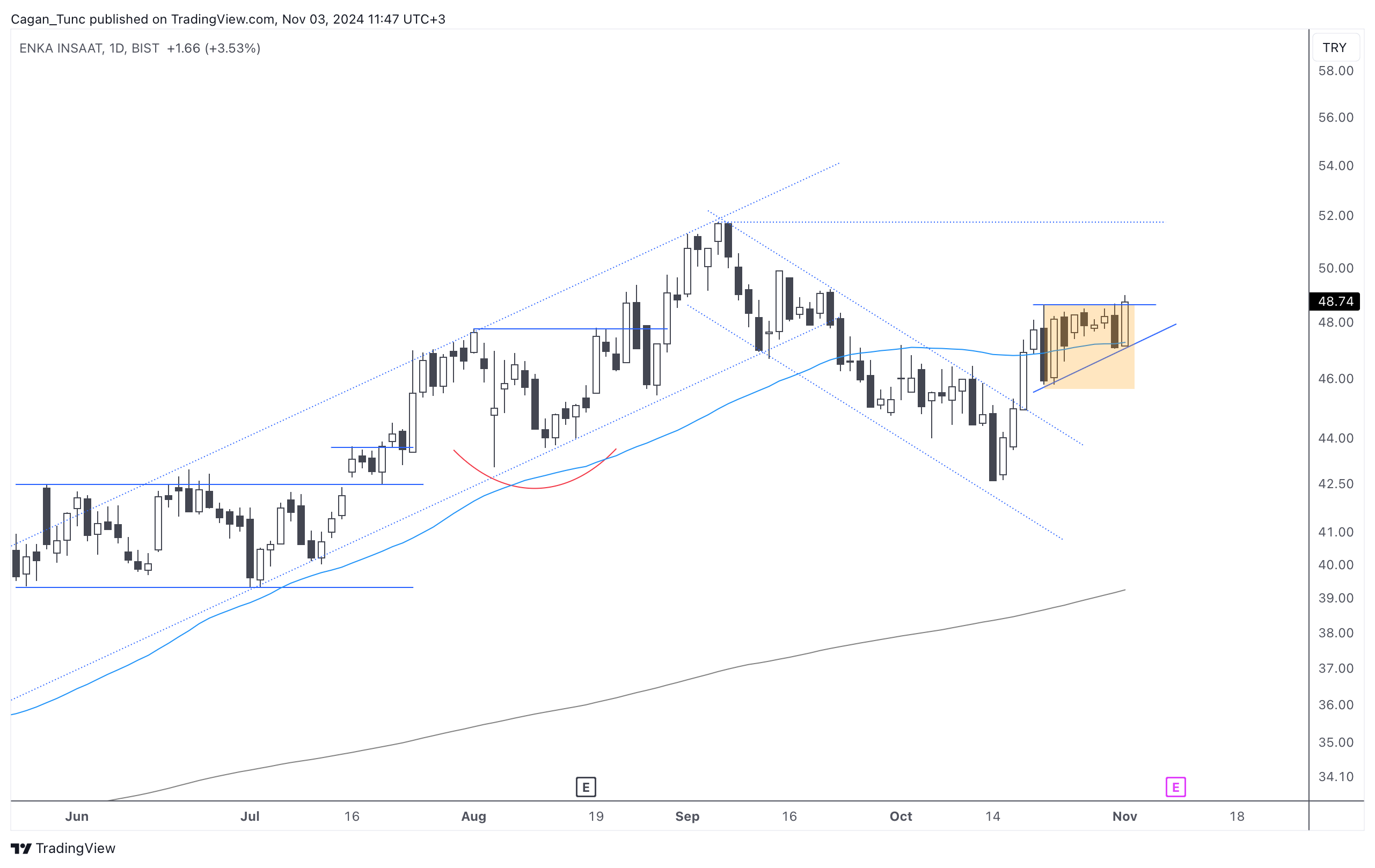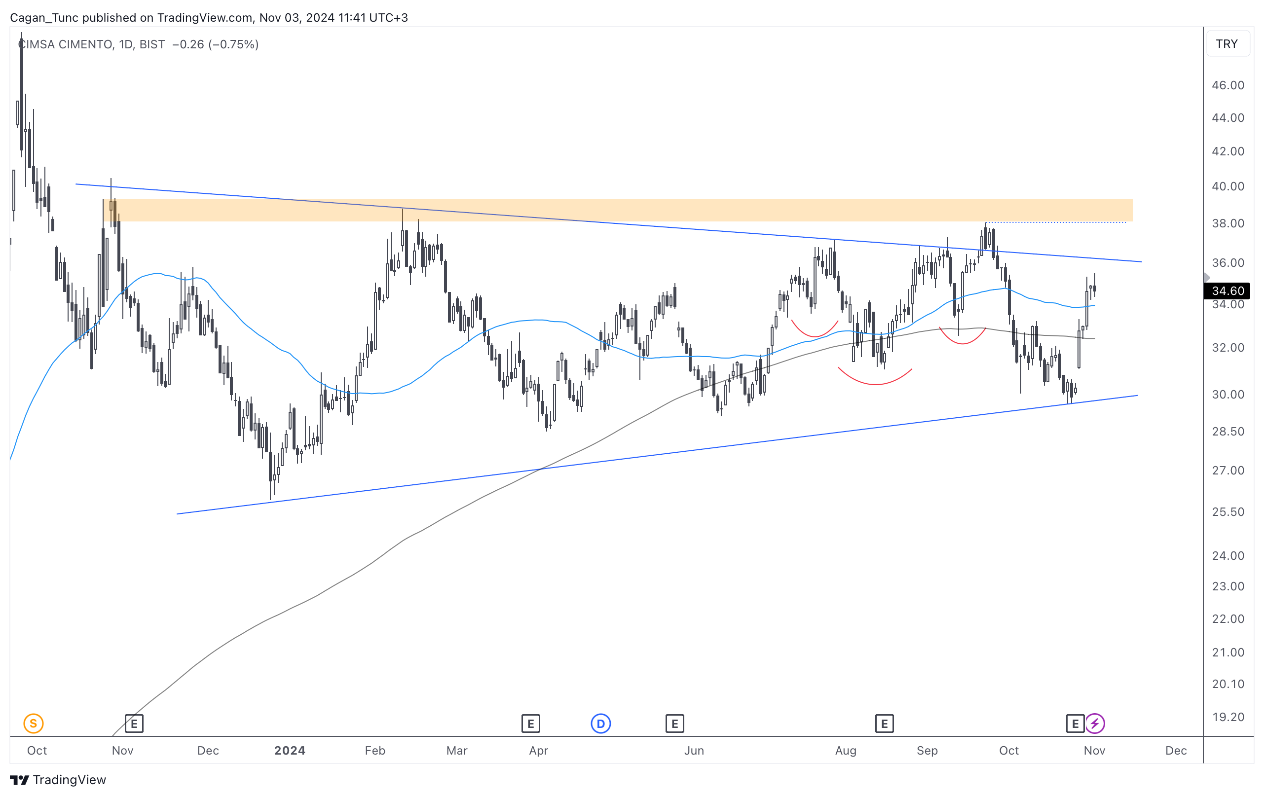 #CIMSA - Turuncu ile belirttiğim direnç bölgesinden sert satış yedikten sonra, bilanço günü ve sonrasında dipten net bir toparlanma geldi. Bu hisse senedinin yakaladığı momentumu devam ettirip edemeyeceğini takip ediyorum.