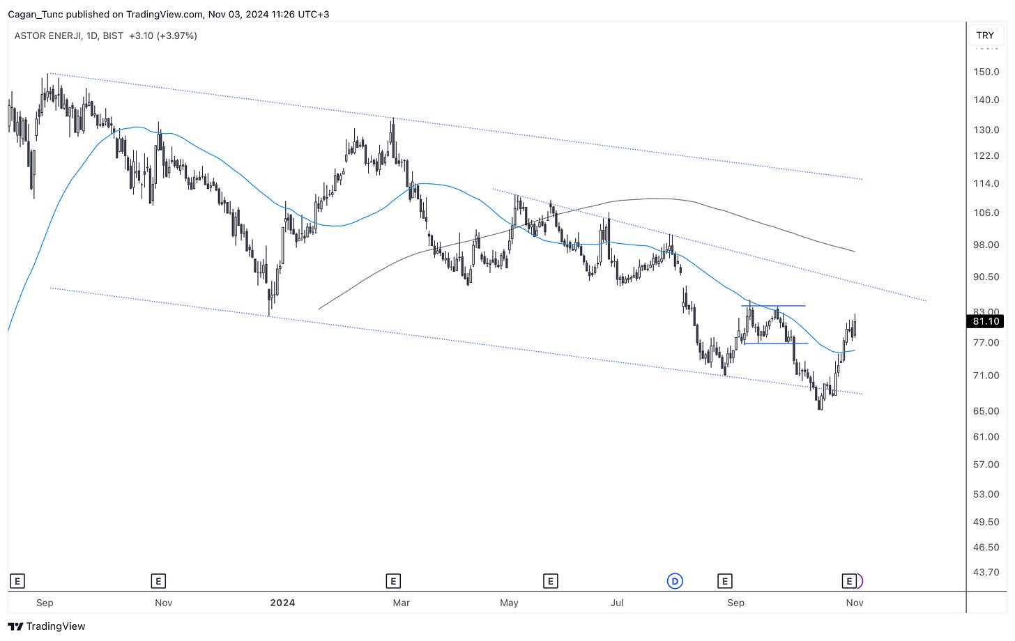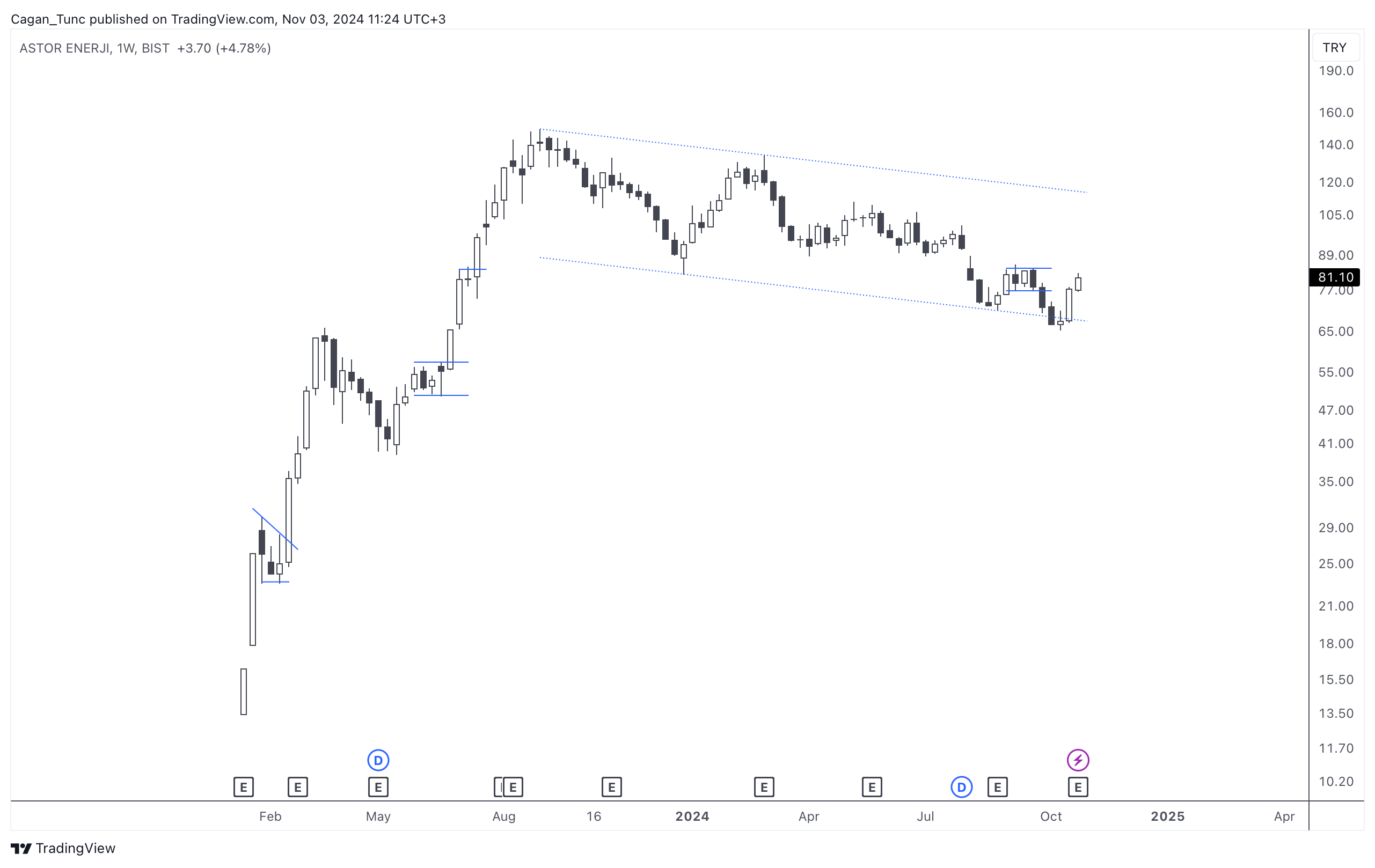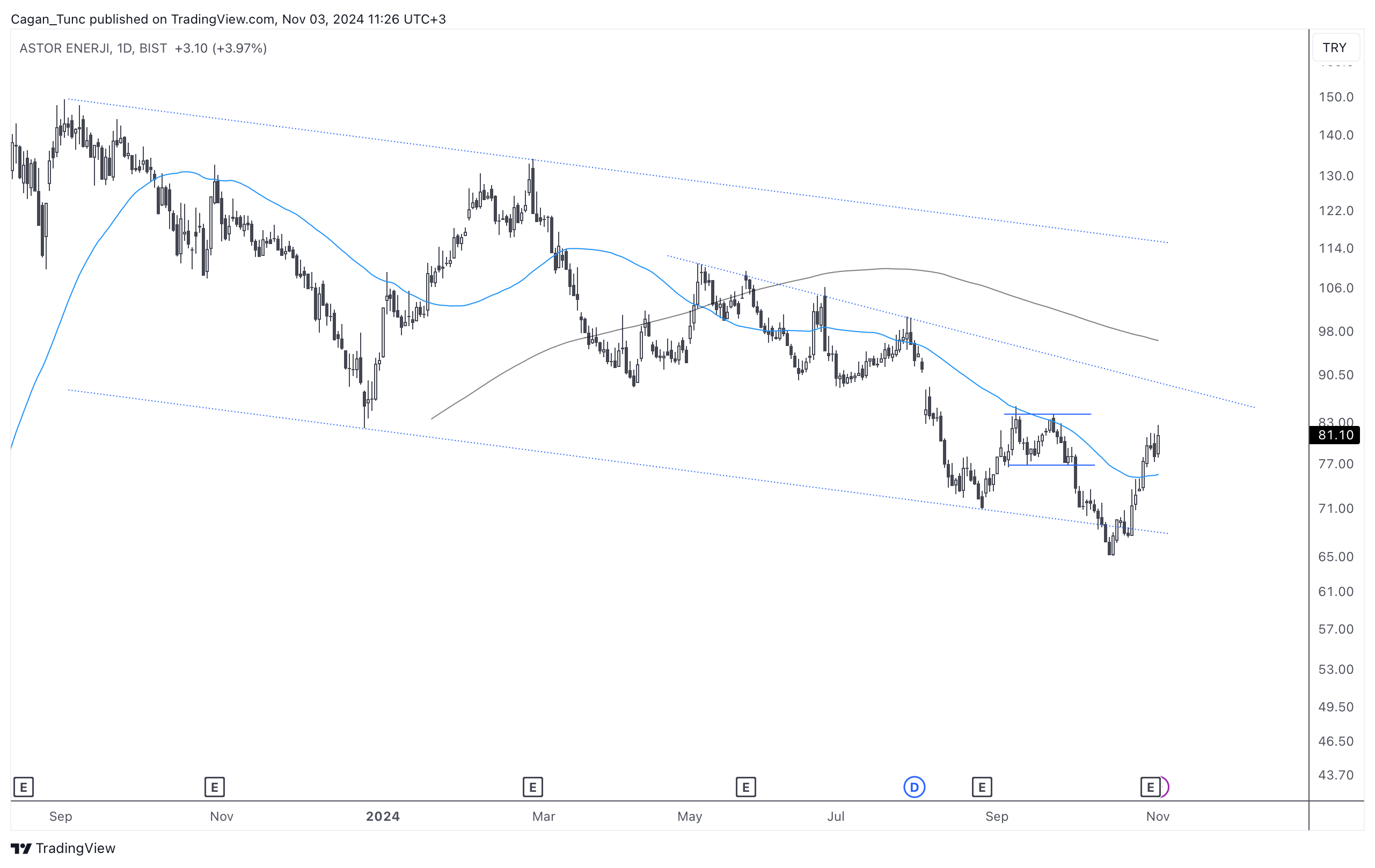 #ASTOR - Uzun süredir alçalan kanal içerisinde hareket eden bu hisse senedi son hafta kanal alt bandından güçlü bir destek buldu. 50 günlük ortalama üzerine yerleşen fiyatın önümüzdeki günlerdeki davranış biçimi önemli olacak.