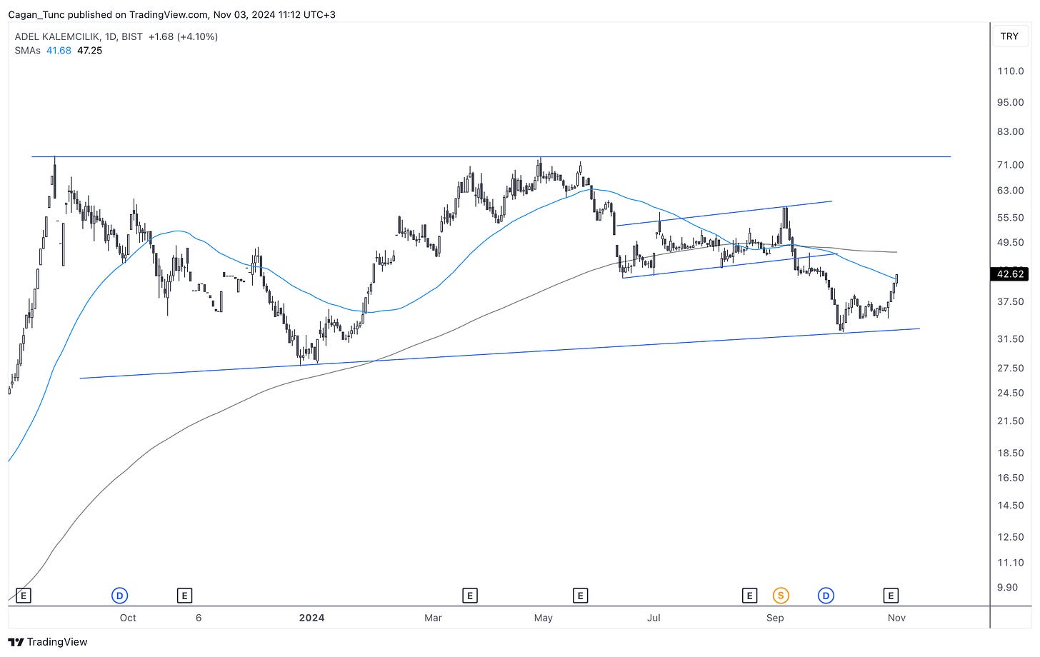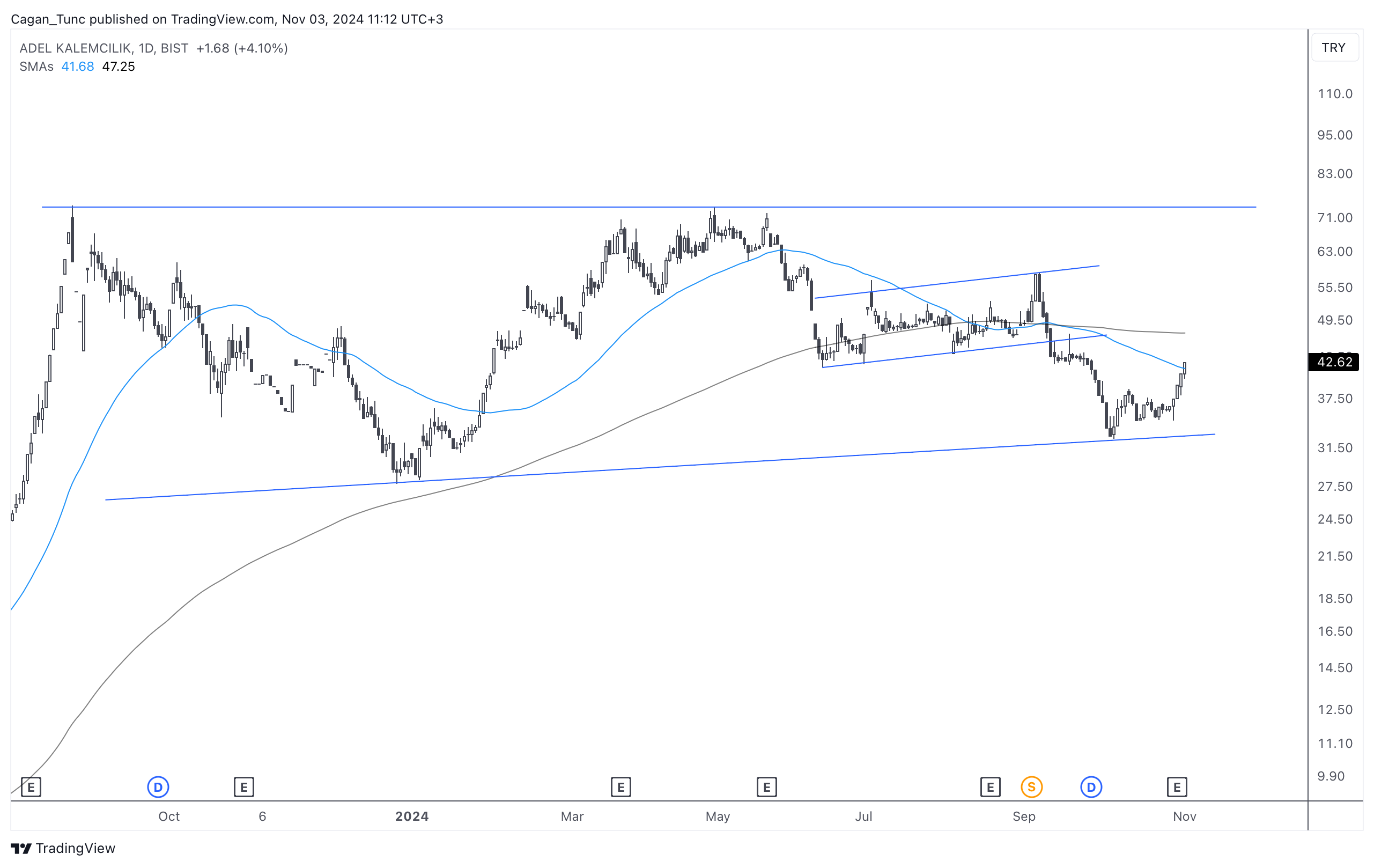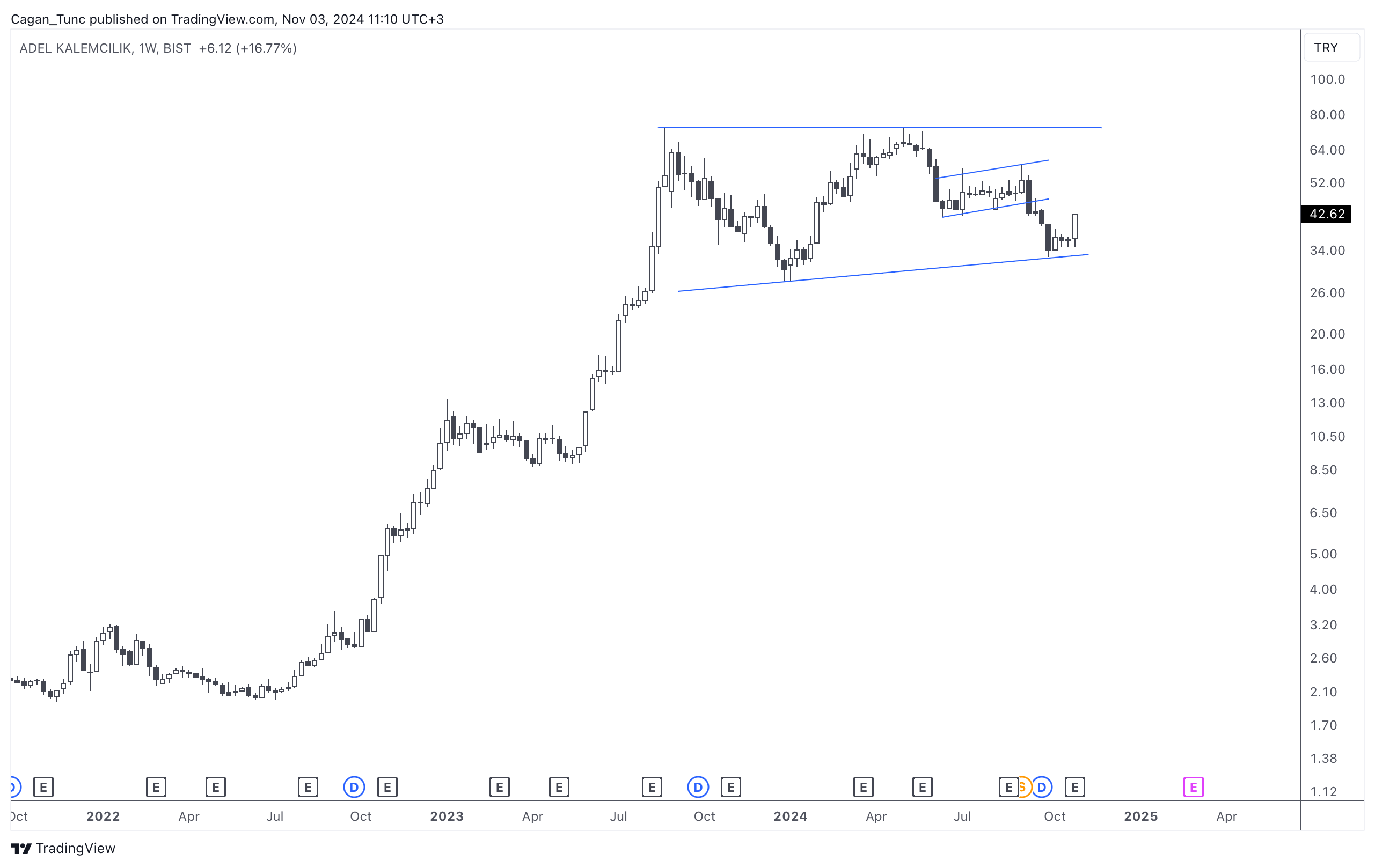 #ADEL - Ağustos 2023’de gördüğü zirve sonrası yatay bir trende giren hisse senedi, son hafta gelen hacimli alımlarla momentum kazanmaya çalışıyor. Cuma kapanışla 50 günlük ortalama üzerine atan fiyat gördüğü zirveyi bir kez daha denemek isteyebilir.