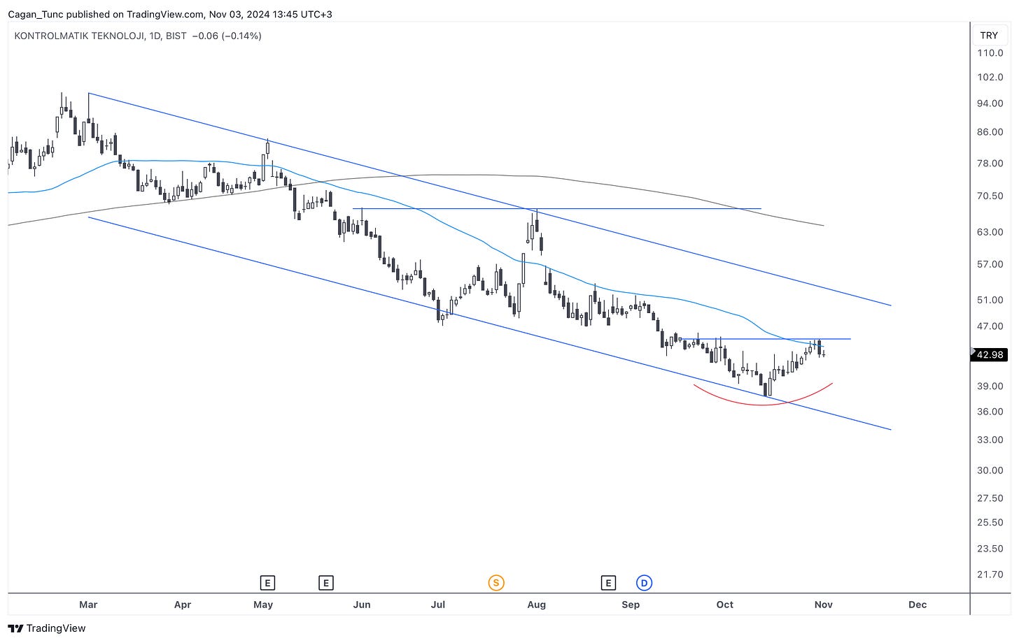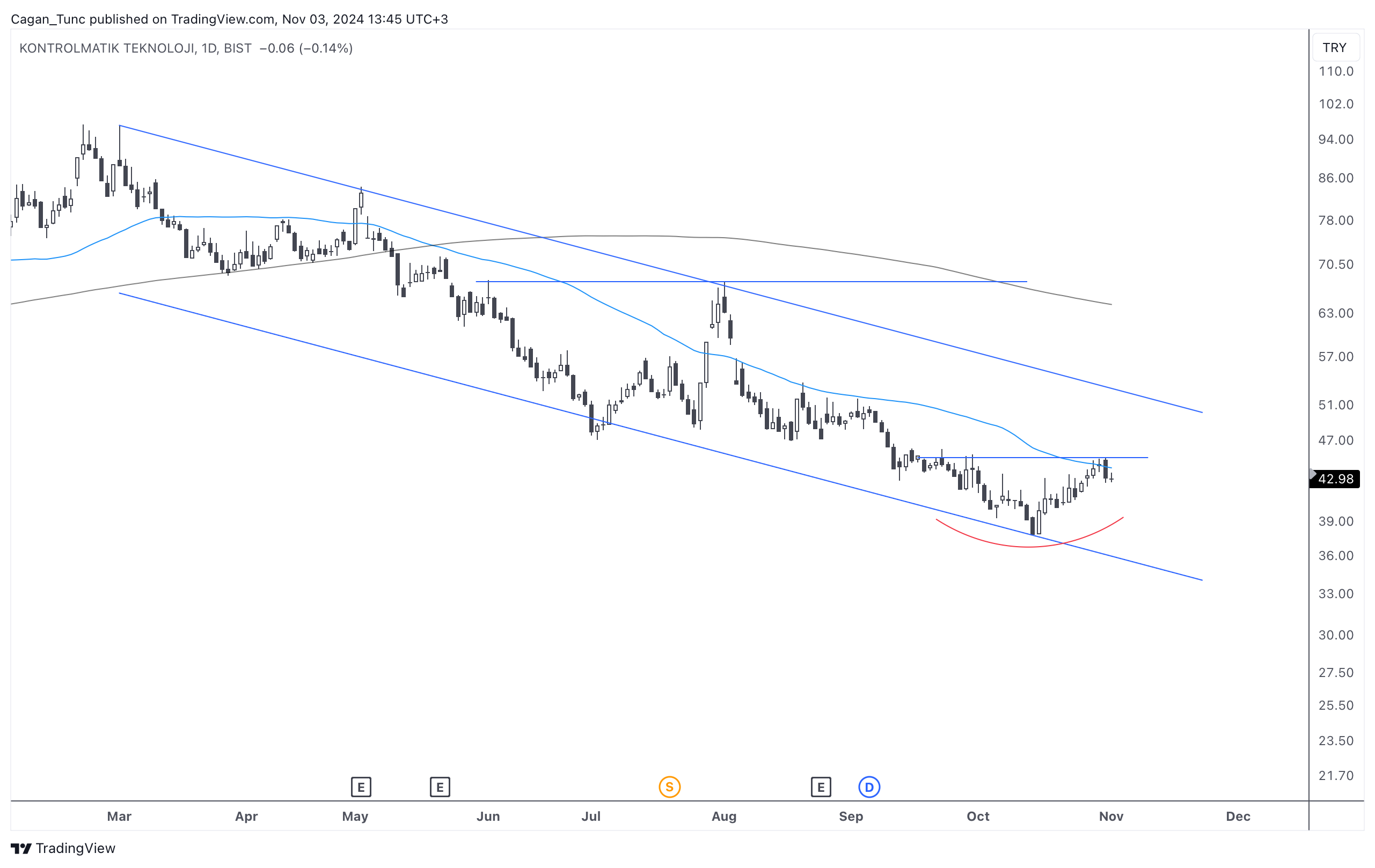 #KONTR - Uzun süredir düşüş kanalı içerisinde hareket eden bu hisse senedi 50 günlük ortalamanın baskısı altında dip yapmaya çalışıyor.
