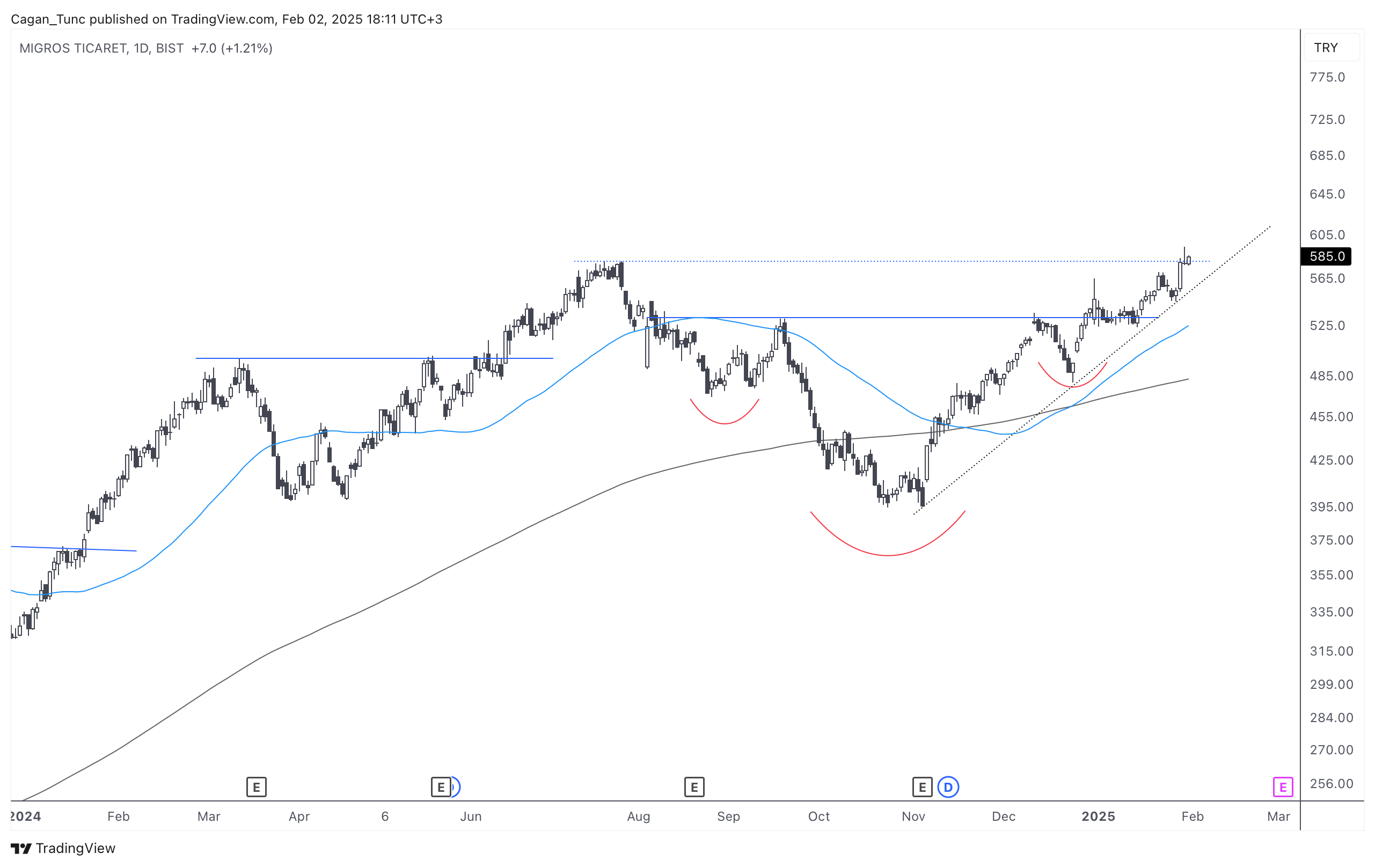 #MGROS - Yükseliş trendi devam eden hisse senedi geçen haftayı da gördüğü en yüksek seviyenin üzerinde, güçlü kapattı. Hareketini blogda ve X’de yakından izlediğim hisse senedini iz süren stop ile takip ediyorum. Hareket boyunca oluşan yükselen trend çizgisi de stop olarak kullanılabilir.