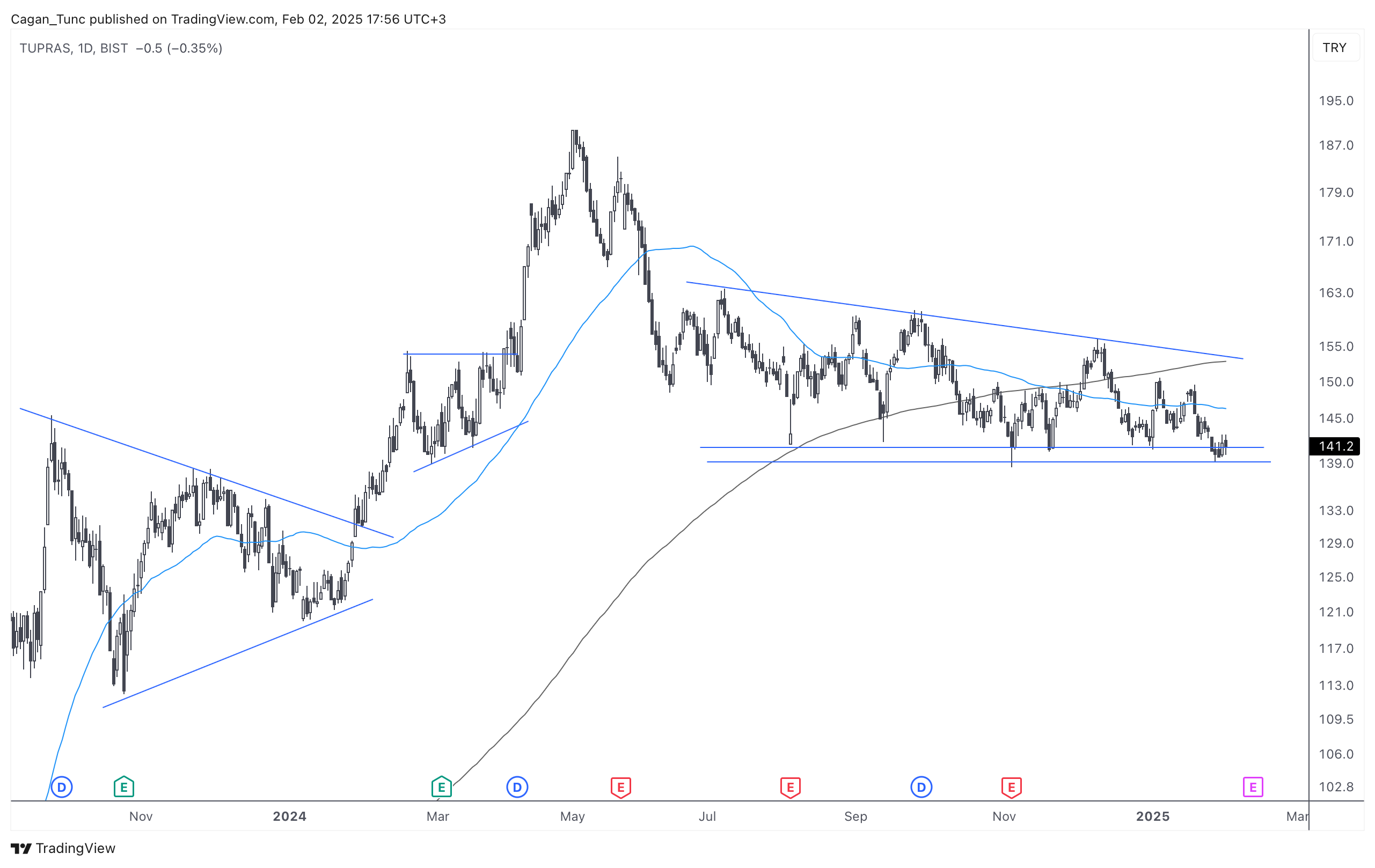 #TUPRS - Ortalamaların altında fiyatlanan ve düşüş trendi devam eden bu hisse senedi önemli destek seviyesinin üzerinde duruyor. Alçalan üçgen görüntüsünün aşağı yönlü kırılımı fiyatı bir boy daha aşağı taşıyacaktır. Benim bakış açıma göre zamana ihtiyacı olan bu hisse senedinin yukarı yönlü momentum kazanabilmesi için fiyatın öncelikle ortalamaların üzerine yerleşmesi gerekiyor.