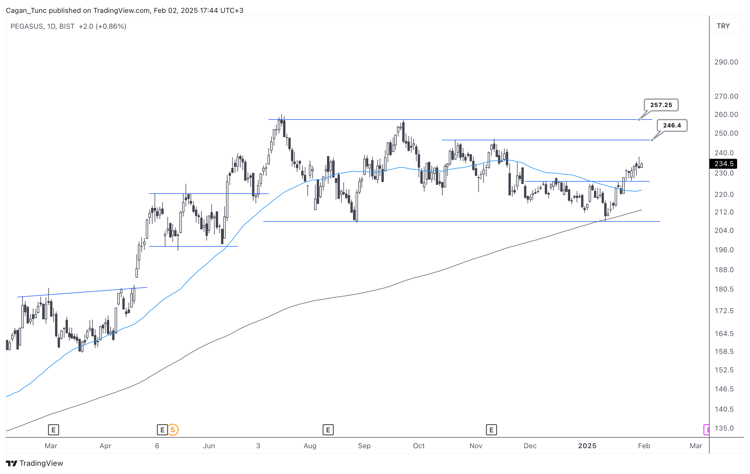 #PGSUS - Büyük resimde dikdörtgen formasyonu takip ettiğim bu hisse senedi endekse görece güçlü hareket etmeye başladı. Kısa vadeli yukarı yönlü momentum yakalayan fiyatın önünde önemli direnç seviyeleri var. Asıl önemli hareket 257-TL seviyesinin kırılımı ile başlayacaktır. 226-TL seviyesi ve 50 günlük ortalama aşağıdaki ilk destek seviyeleri.