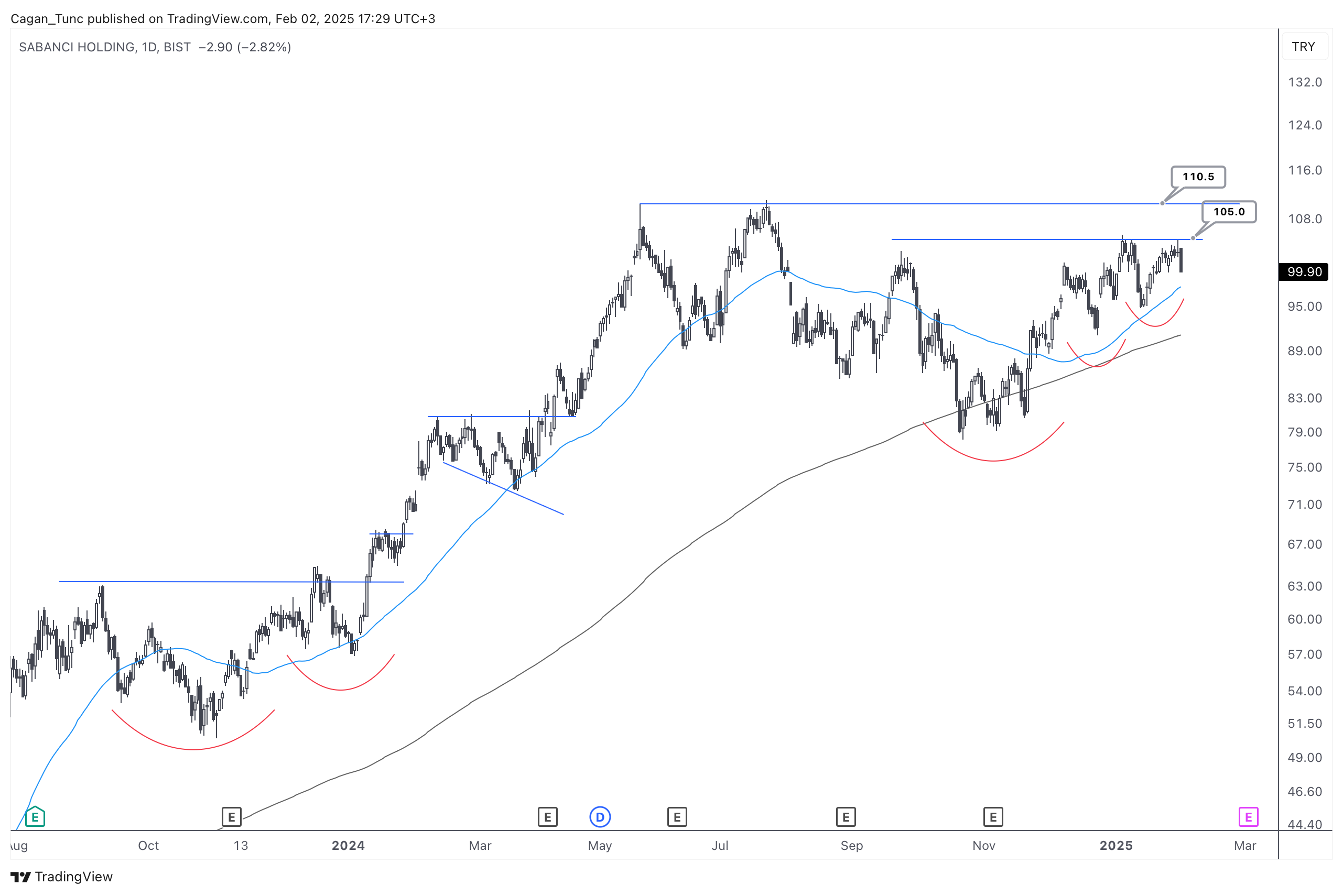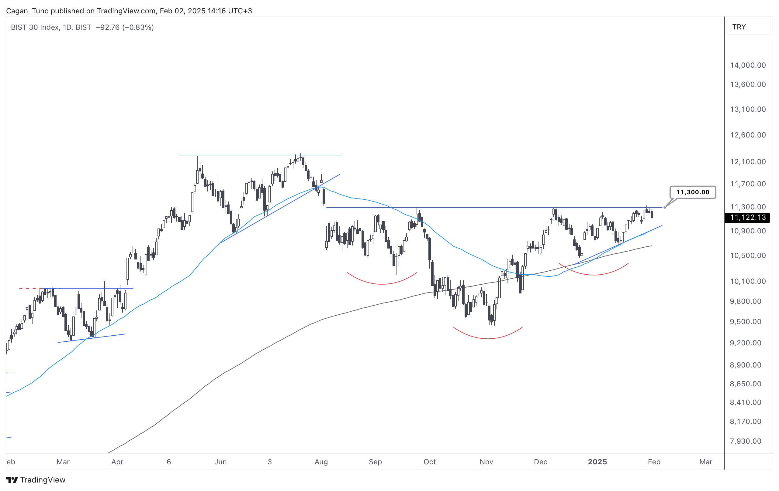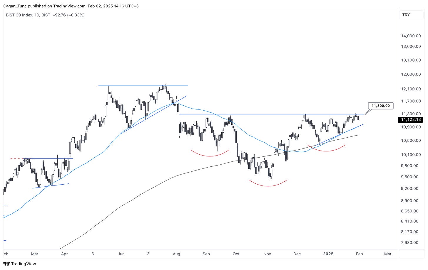 Hisse senetlerinden önce genel görüntüyü görebilmek için #Borsaistanbul #XU030 endeks grafiğiyle başlayalım. Kasım 2024 itibariyle dipten dönüş gerçekleştiren ve kısa bir ralli sonrası Aralık ortasından bugüne yatay bir konsolidasyon içerisine giren endeks için 11300 seviyesi önemli direnç. Fiyat bu seviye üzerine yerleşene kadar kısa-orta vade traderlar için agresif olmayı gerektiren bir ortam yok. Fiyat bir süredir kendisini destekleyen 50 günlük ortalamanın üzerinde kaldığı sürece direnç bölgesi denenmeye devam edecektir. 50 günlük ortalama altında fiyatın uzun dönem ortalamaya doğru çekilmesi doğal bir hareket olur.