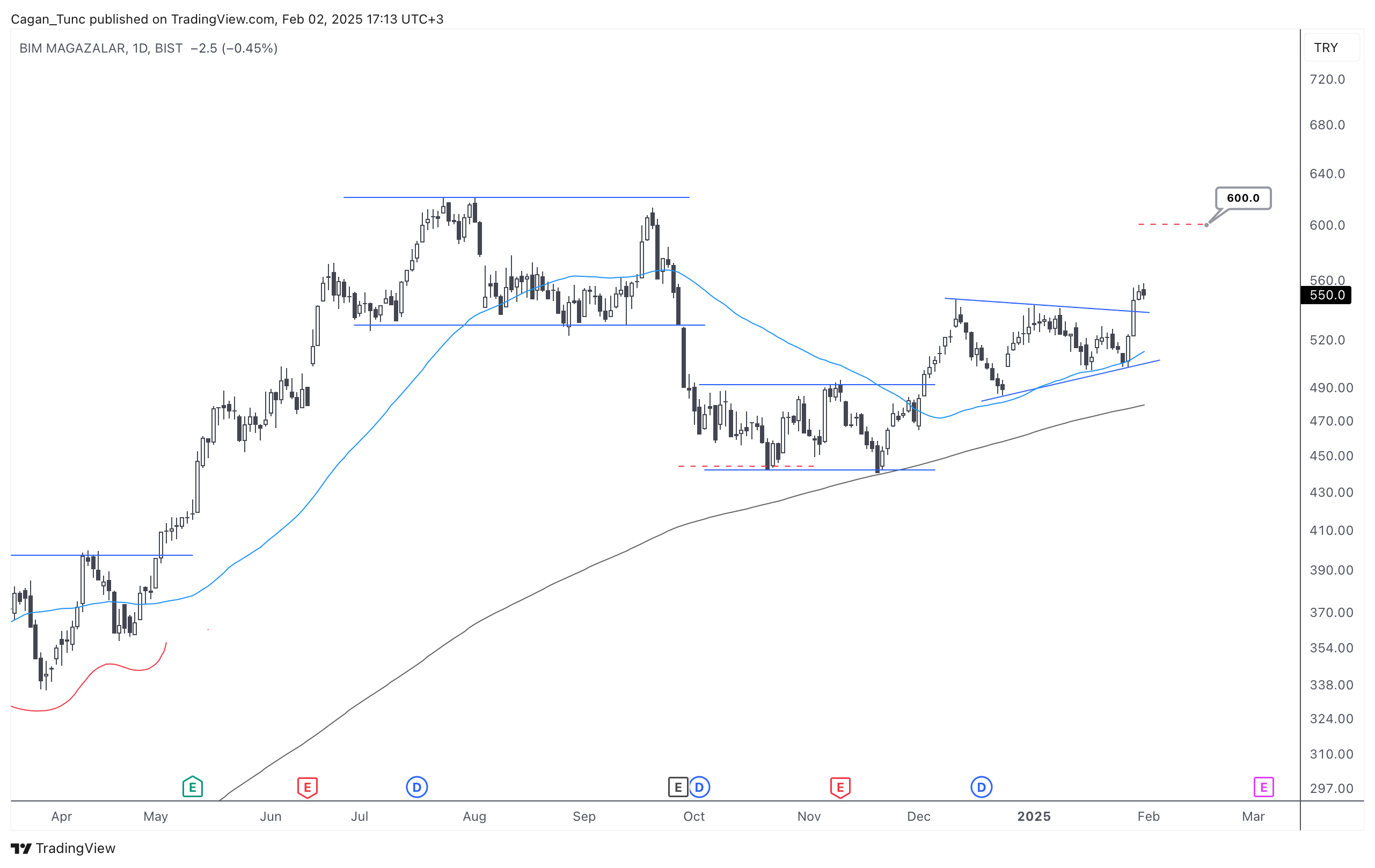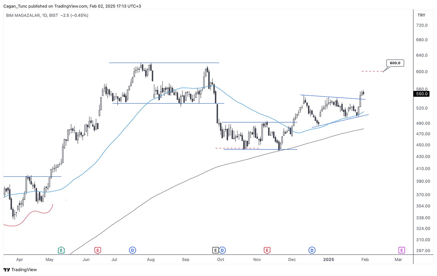#BIMAS - Geçen hafta endekse görece güçlü hareket eden ve hacimli alışlar gelen hisse senedi grafiğinde takip ettiğim simetrik üçgen formasyonu kırıldı. Bu formasyonun hedefi 600-TL. Fiyat formasyon içerisine geri dönmediği sürece fiyat hedefi takip edilebilir. 50 günlük ortalamanın uzun süredir fiyata destek olduğunu görebilirsiniz.