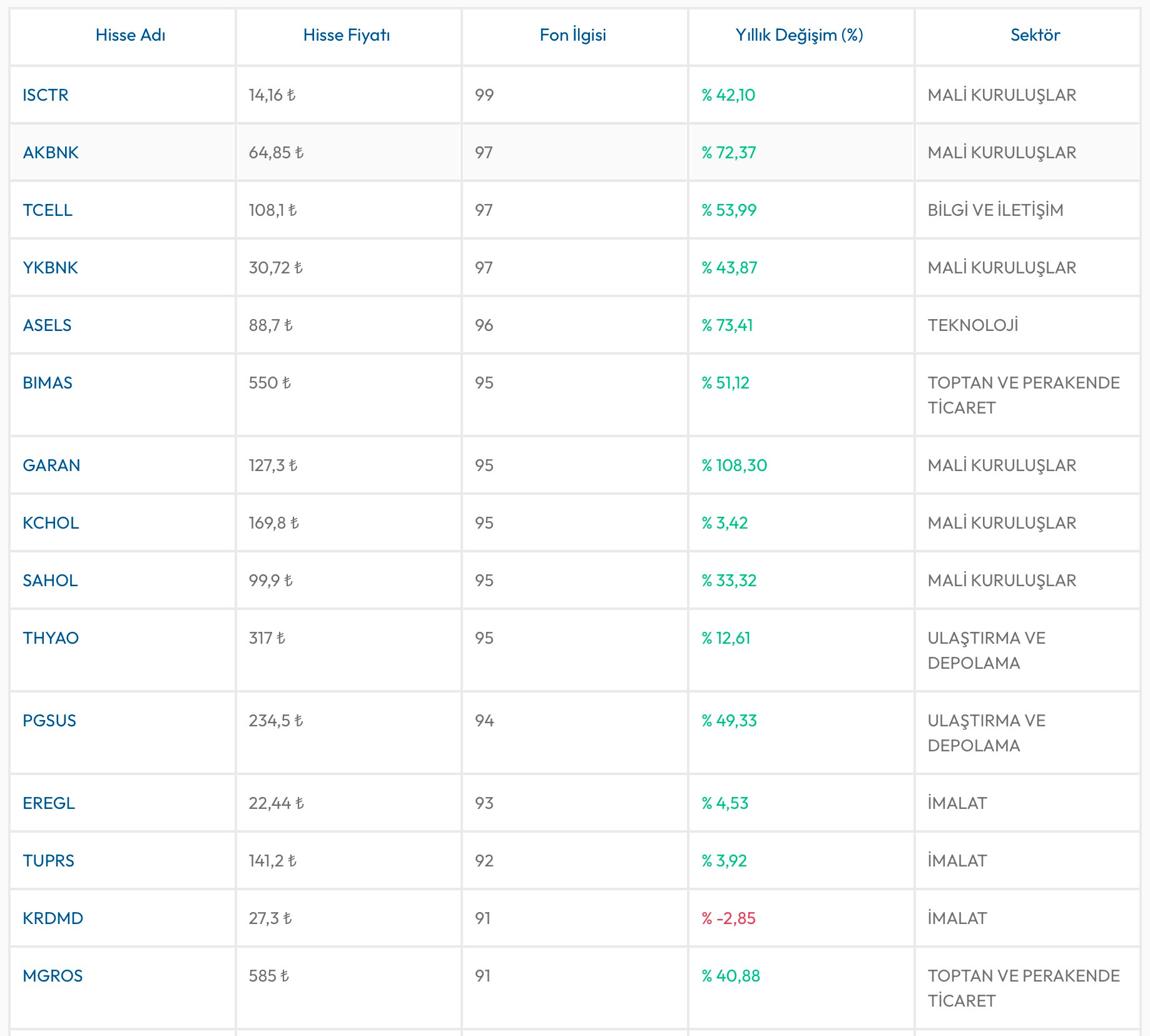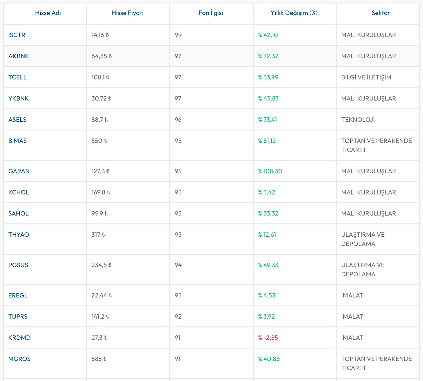 Fonların hisse senetlerine güncel ilgisini takip edebilmek için “Fundflux” sitesini kullanıyorum. Bu konuda sizinde takip ettiğiniz kaynaklar varsa yorumlarda paylaşırsanız çok memnun olurum. Fundflux sitesinde 02.02.2025 itibariyle fonların en fazla ilgi gösterdiği ilk 15 hisse senedi aşağıdaki gibi sıralanmış: