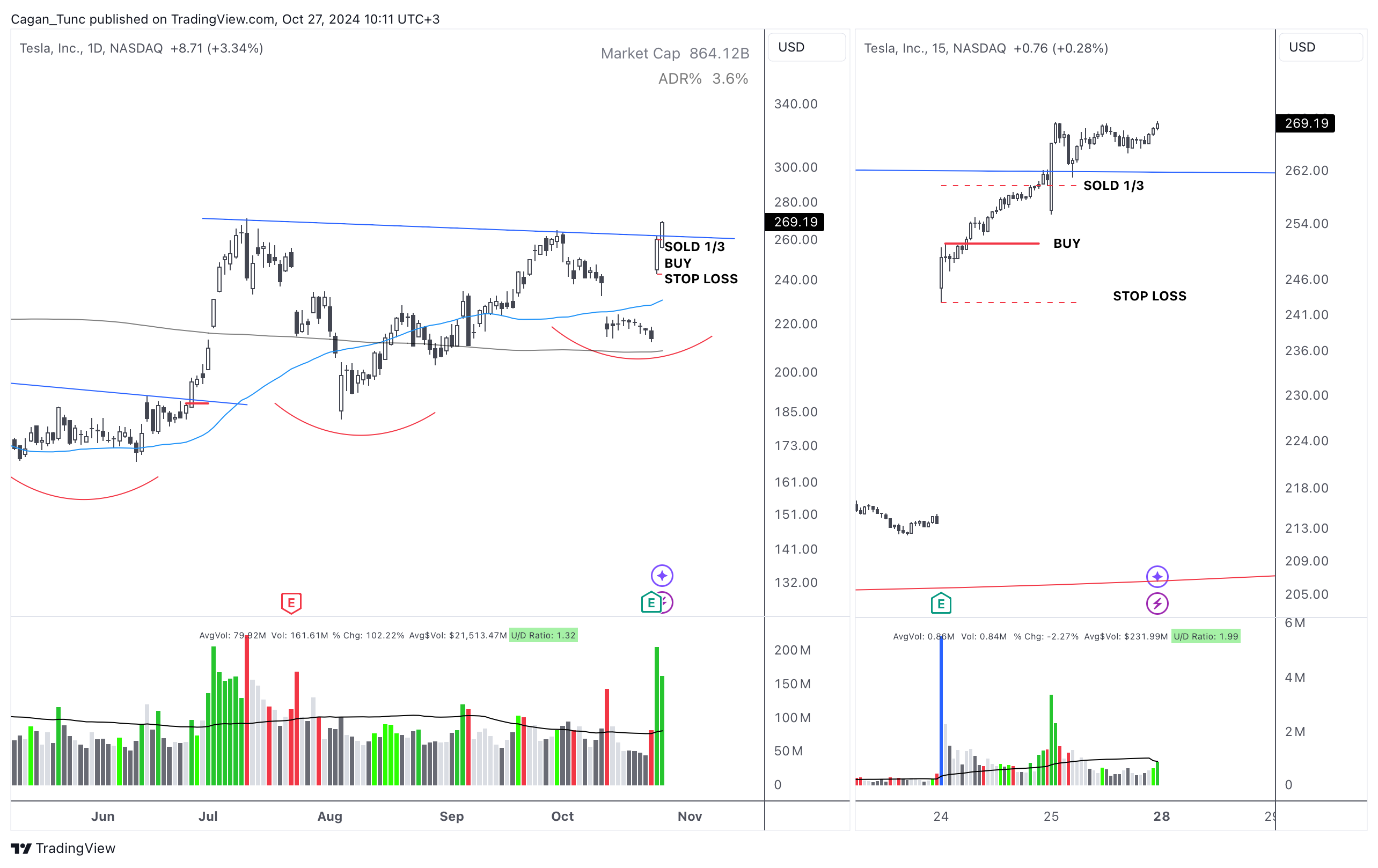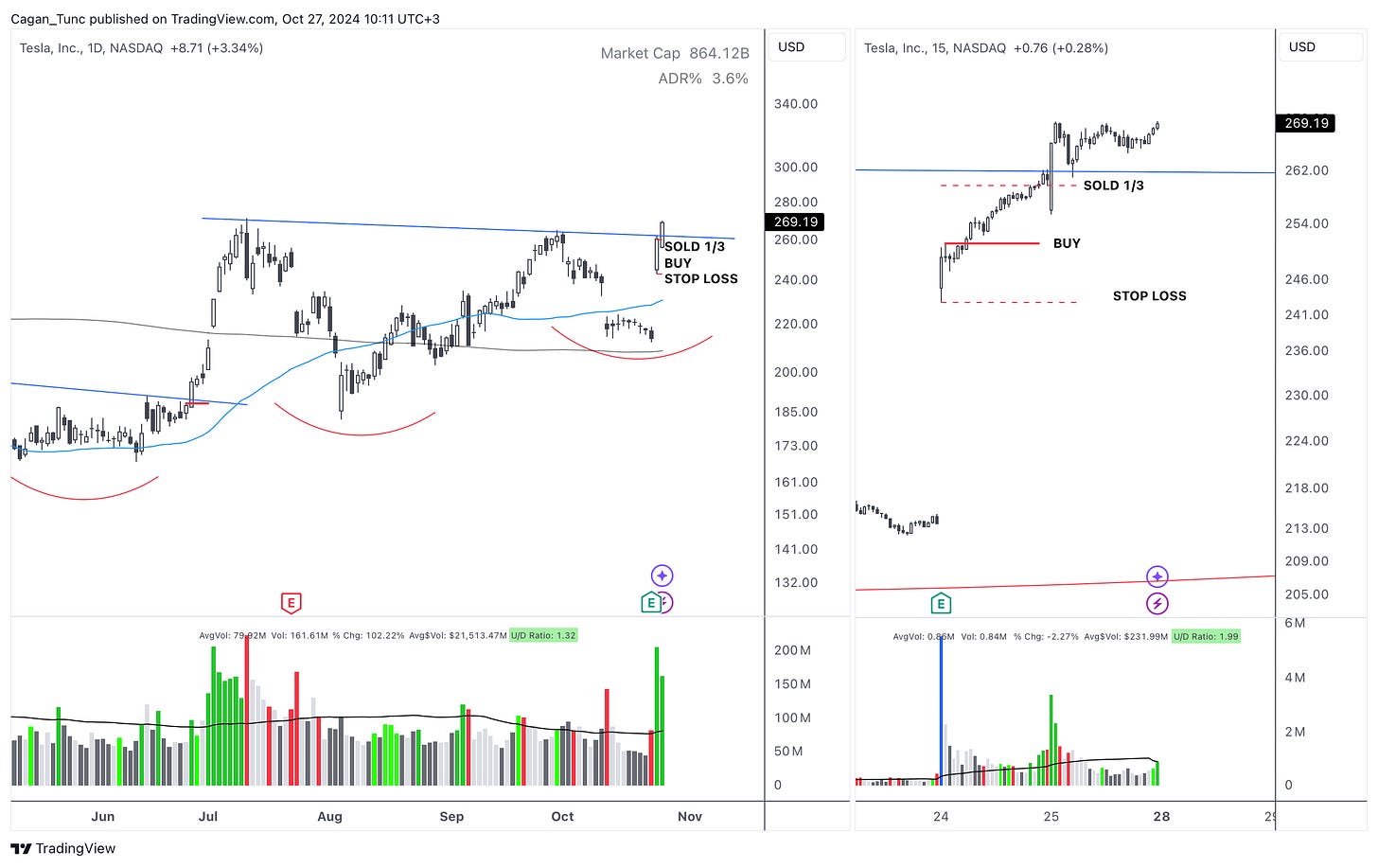 Yukarıda bahsettiğim screener ile geçen hafta önüme düşen #TESLA hisse senedininde nasıl pozisyon aldığımı ve riski nasıl yönettiğimi grafik üzerinde göstermeye çalıştım. Beni yakından takip edenler gün içi alımları genellikle 15 dakikalık grafikler ile yaptığımı biliyorlar. Açılış sonrası ilk 15 dakikada yüksek hacimle oluşan güçlü mumu incelerseniz pozisyon almak için beklediğimiz ilk sinyal olduğunu ve bu mumun kırılımı ile pozisyon aldığımı görebilirsiniz. 5, 30 ya da 60 dakikalık grafikleri kullanarakta uygulayabileceğiniz bu yöntemin adı “Opening Range Breakout (ORB)”. Bu konuda araştırma yaparak daha detaylı bilgi sahibi olabilirsiniz. Eğer gün sonunu beklemiyor ve gün içi alımlar yapmanız gereken bir sistem oluşturuyorsanız, sisteminizin en önemli parçalarından biri burası olacak. ORB olsun olmasın kendi sisteminize en uygun gün içi alım stratejisini en hassas şekilde oluşturmalısınız. İnanın bana bu çok zor bir görev ve sadece tecrübeyle, deneme-yanılmayla, farklı piyasa koşullarında farklı enstrumanlarda defalarca yapılması gereken back-testlerle son hale getirilebilecek bir iş. Bu nedenle bana göre bu işe yeni başlayanların veya sürdürülebilir bir sistem oluşturma yolunda olanların gün sonu kapanış mumuyla işlem yapmaları en doğru olanı. Neyse devam edelim. Bu tip gapli açılışları trade ederken kullandığım initial stop loss seviyesi ise gün içi görülen en dip seviye. Her trade için istisnasız, açtığım pozisyonun bir kısmını önceden belirlediğim bir R multiple seviyesinden veya teknik bir seviyeden risk yönetimi amacıyla hızlıca sattığımı yine beni yakından takip edenler biliyordur. Bu konuda blog’da farklı yazılar bulabilirsiniz. Cuma günkü güçlü kapanış sonrası geldiğimiz noktada artık riski teorik olarak neredeyse sıfırlanmış olan bu pozisyon için trend takibi yapıyorum…