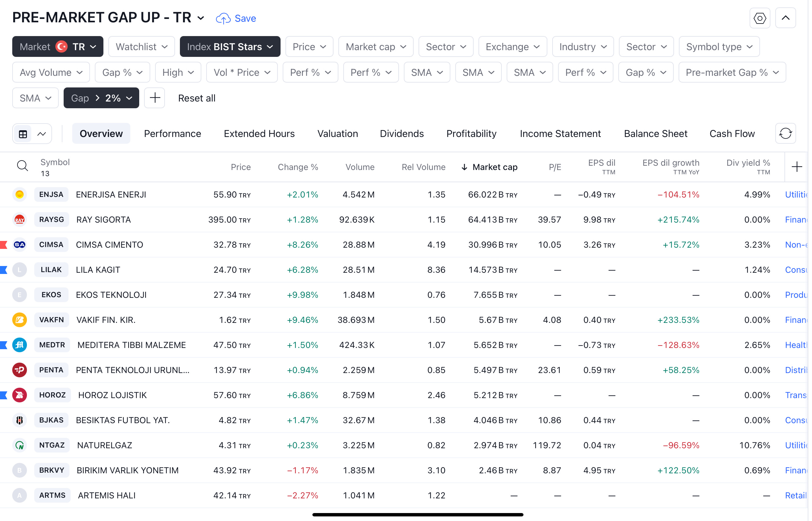 Biliyorsunuz #Borsaistanbul’da “Pre-market” uygulaması yok ama seans açıldıktan sonra ilk 5-10 dakikada benzeri bir tarama yaparak güçlü açılış yapan hisse senetlerini tespit edebilir ve aksiyon alabilirsiniz. Bunun için kullandığım screener’ın görüntüsünü de aşağıya bırakıyorum. Ben genellikle likit olan hisselerde gapli açılışları trade ettiğim için arama sadece YILDIZ pazar ile sınırlı. Siz istediğiniz gibi modifiye edebilirsiniz. Örneğin bu screener’ı kullanarak #CIMSA’nın cuma günkü hareketini yakalayabilirdiniz ama ben bu yöntemle dipten dönüşleri değil momentum yakalamış hisseleri trade ediyorum. #CIMSA ile ilgili güncel düşüncelerimi paylaştığım posta aşağıdaki linkten ulaşabilirsiniz.
