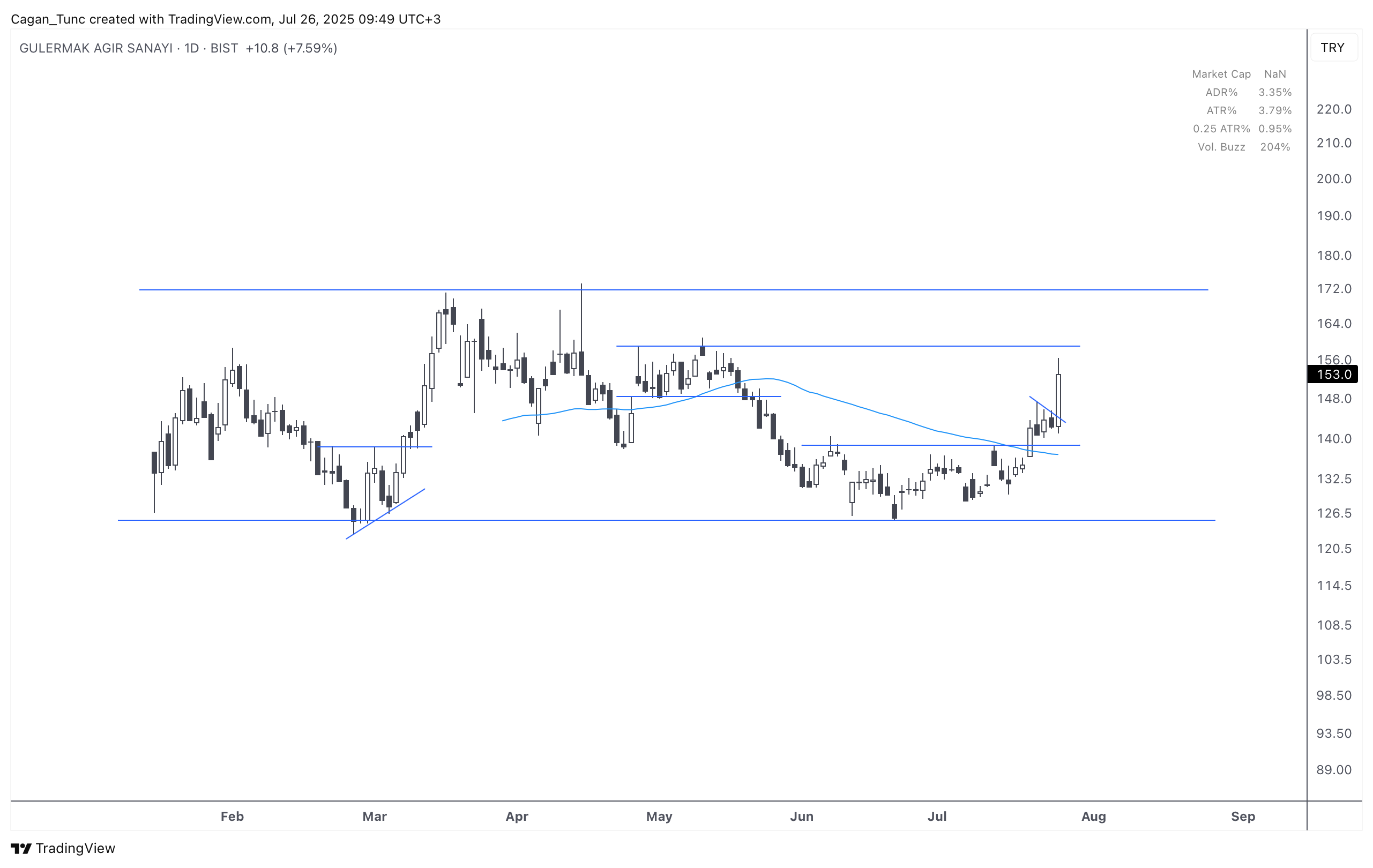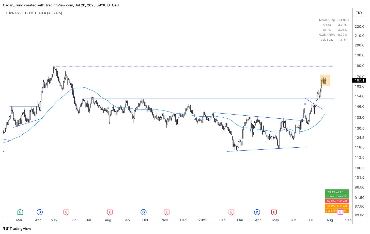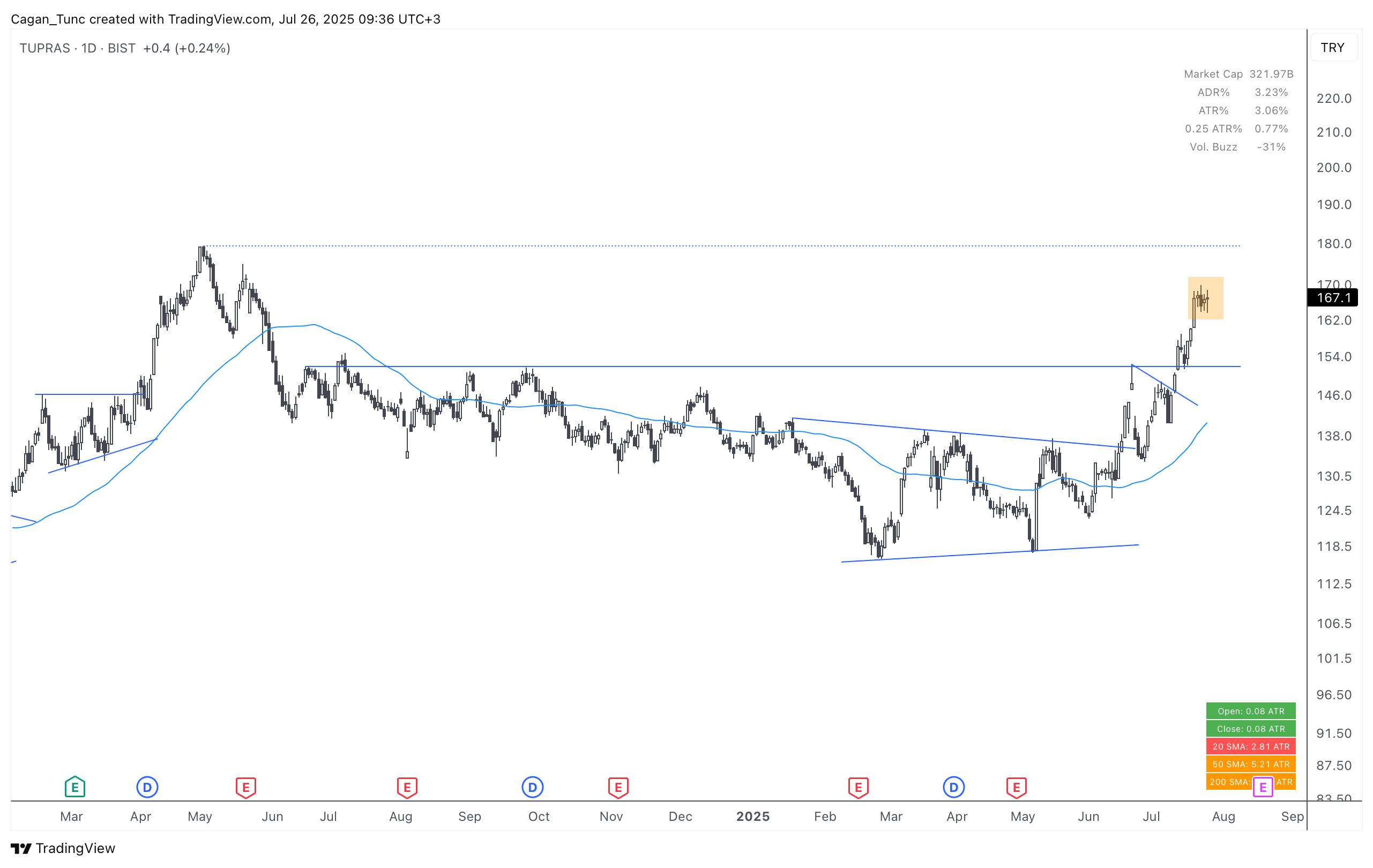 Uzun süredir devam eden konsolidasyondan güçlü çıkan hisse senedi geçen hafta yatay bir düzeltme yaptı. İlk hedefi 180-TL olan hissede başlayan yükseliş trendi turuncu bölgeden çıkış ile devam edebilir.