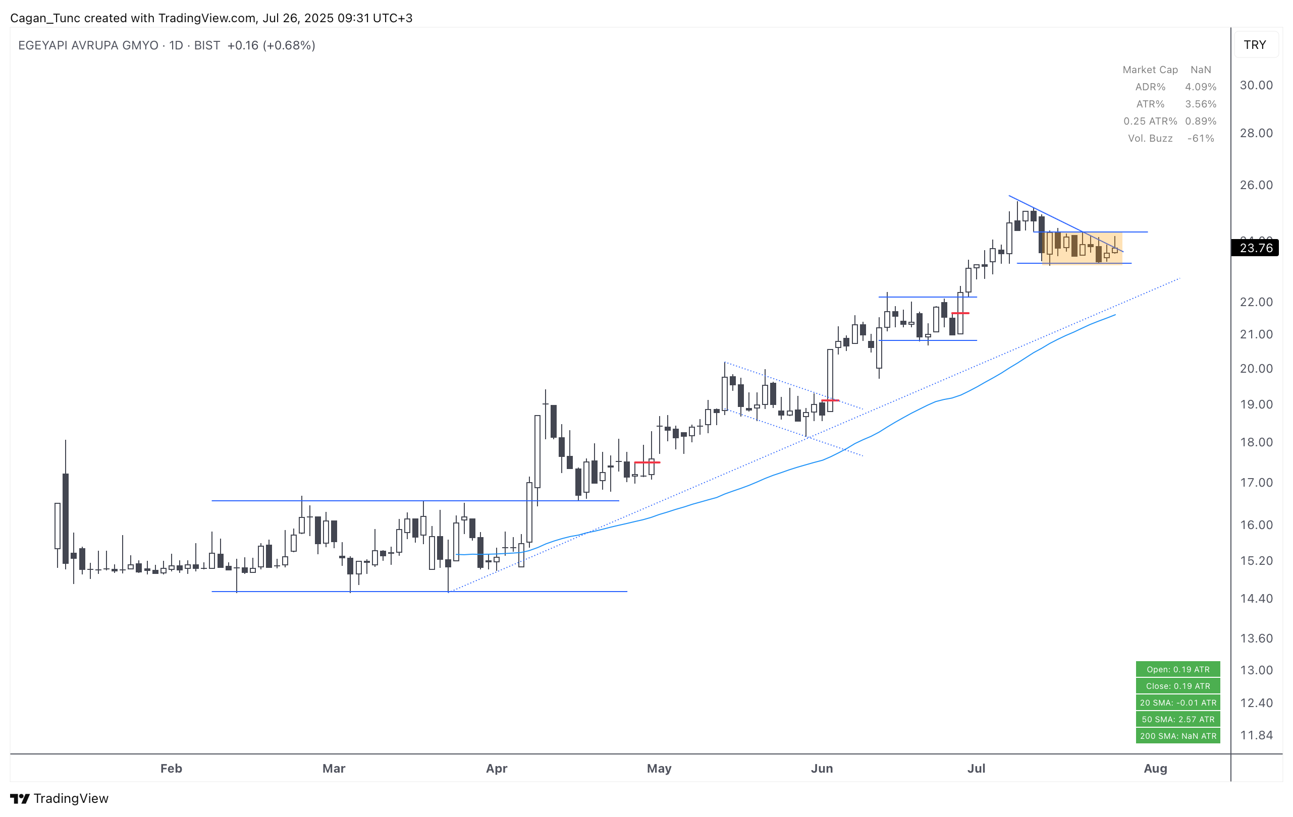 Orta vadeli yükseliş trendi devam eden ve daha önce güzel trade fırsatları veren hisse senedi bir süredir yatay konsolidasyon sürecinde. Hisse senedi turuncu ile gösterdiğim bölgeden hacimli bir mumla çıkabilirse yukarı yönlü hareket devam edebilir.