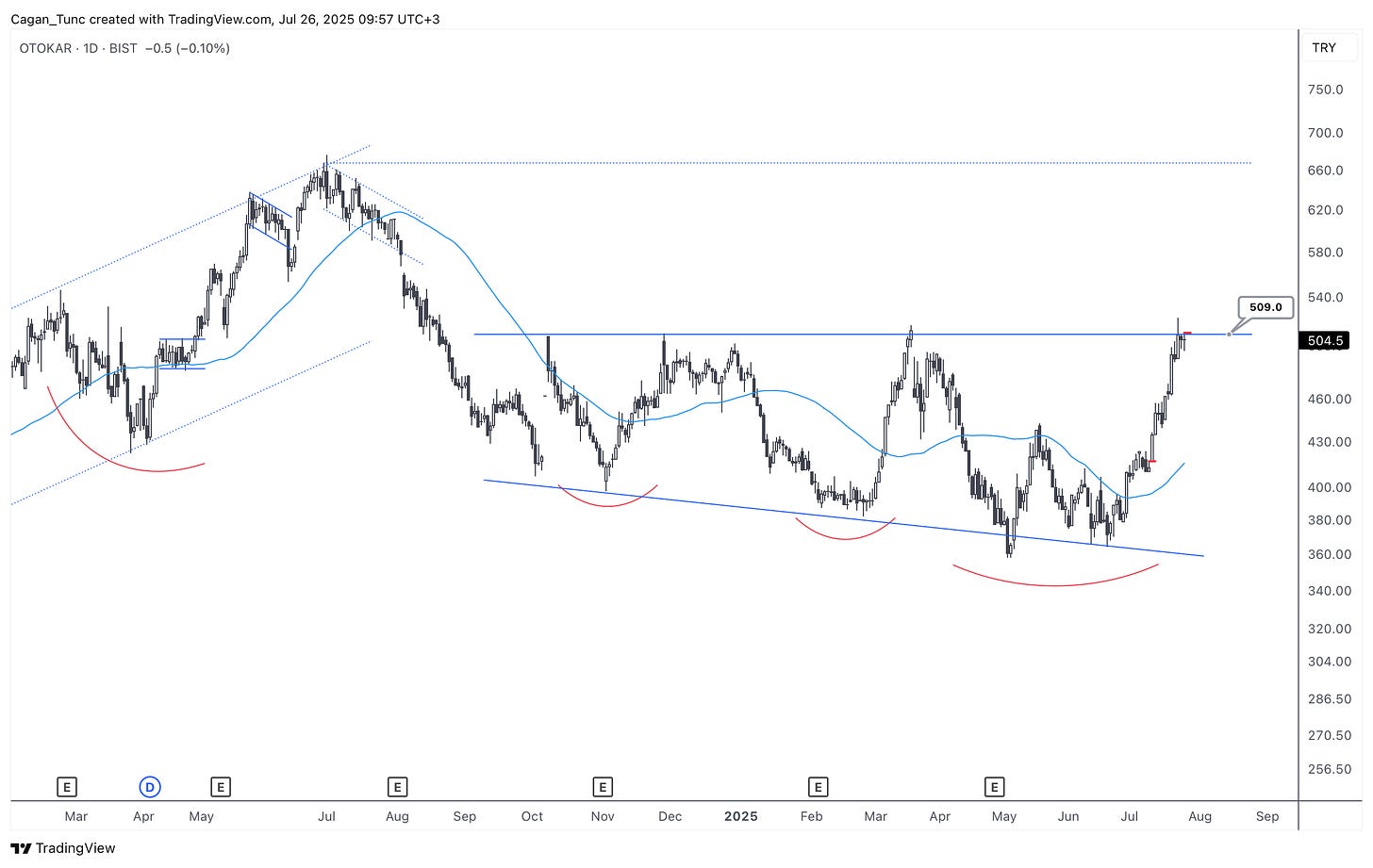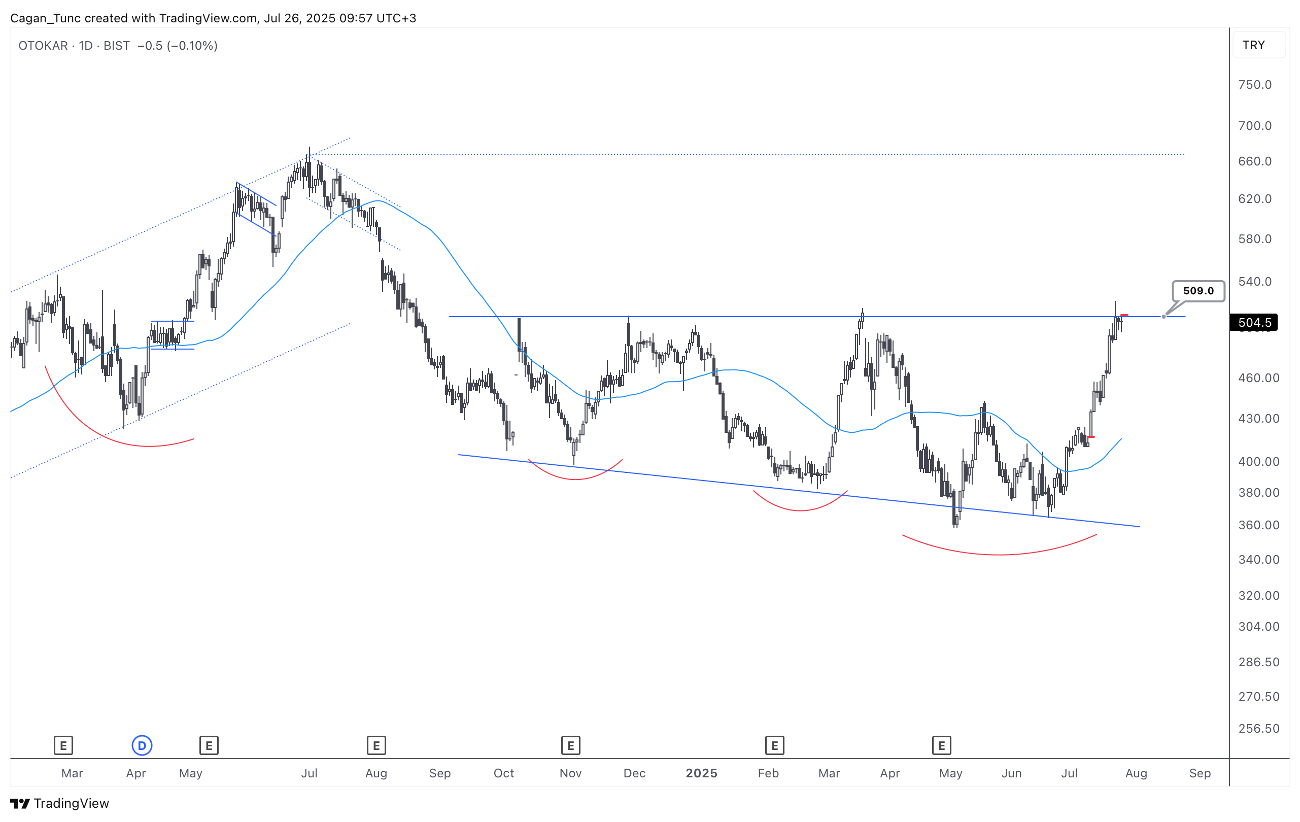 Dipten güçlü momentum yakalayan hisse senedi güçlü direnç seviyesinin hemen altında dinleniyor. 510-TL seviyesinin kırılması grafikte yeni bir oyun alanı açabilir.
