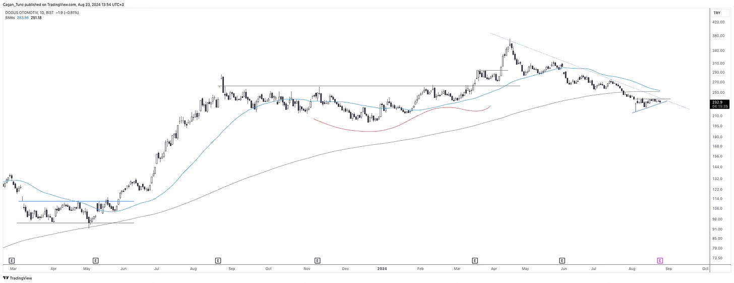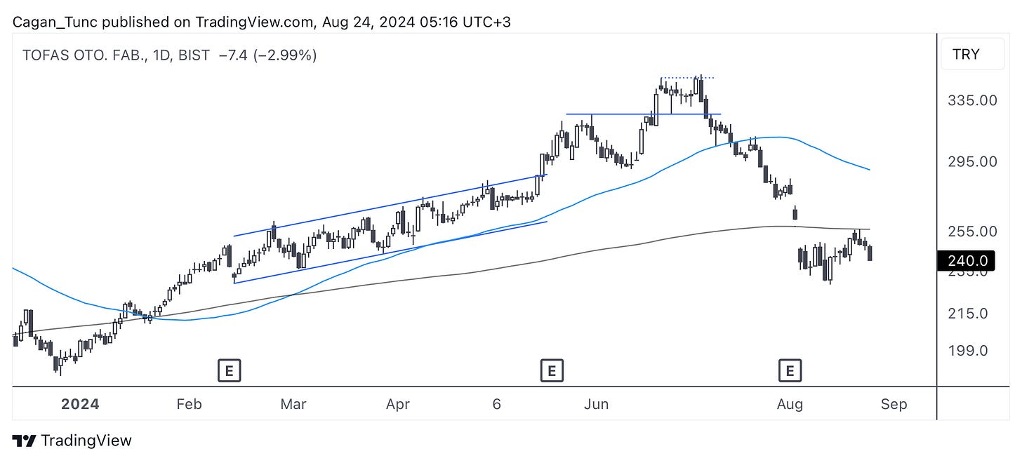 #TOASO - Endeksten önce düzeltmeye giren hisse senetlerinden biri olan TOASO’da düşüş trendi devam ediyor. Şu an için bir dönüş formasyonu gözlemlemediğimiz hissenin öncelikle uzun dönem ortalamanın üzerine atması gerekiyor.