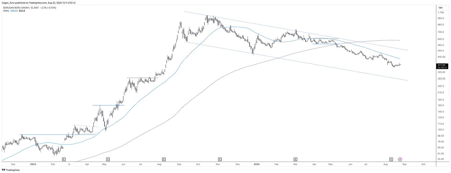 #BRSAN - Ortalamaların altında fiyatlanan bu hisse senedinde kanal içerisinde düşüş trendi devam ediyor. Bugün için gözlenen bir dönüş formasyonu yok.