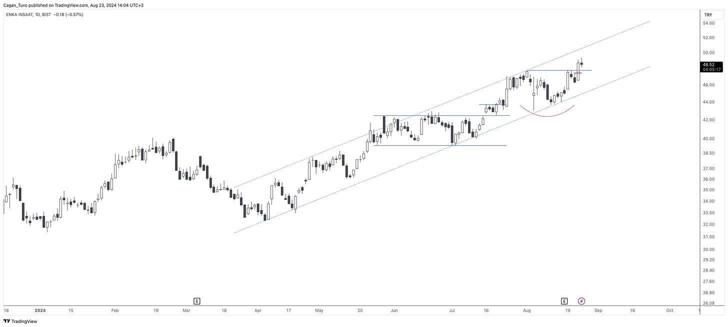 #ENKAI - Düzeltme dönemini güçlü geçiren bu hisse senedi yükselen kanal içerisindeki yukarı yönlü trendine devam ediyor.