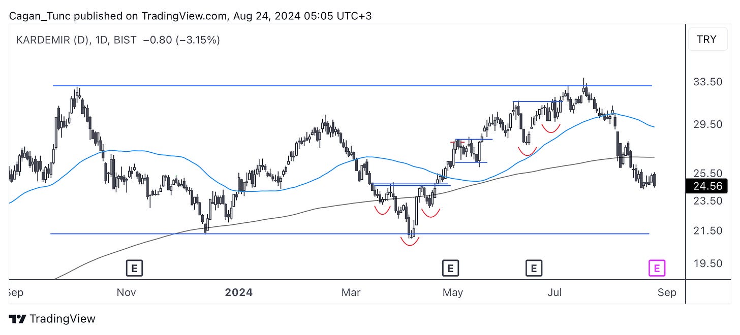 #KRDMD - Ekim 2023’den bu yana 21-33 seviyeleri arasında gidip gelen bu hisse senedi, endeks düzeltmesi öncesi güçlü bir hareket ile bu konsolidasyon bölgesinin üst sınırına ulaştı. Düzeltme ile sert bir geri çekilme yaşayan hisse momentumunu kaybederek ortalamaların altında fiyatlanmaya başladı. Aşağıda 21 önemli teknik destek. Yukarı yönlü bir hareket başlatabilmesi için fiyatın önce ortalamaların üzerine yerleşmesi gerekiyor.