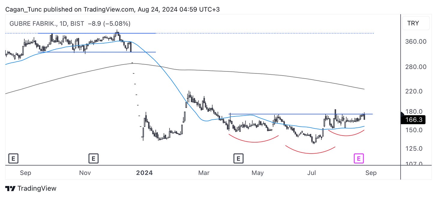 #GUBRF - 2023 yılı sonlarında gelen sert satışları sindirmeye çalışan bu hisse senedinde dipte oluşan bir TOBO görüntüsü var. Hala uzun dönem ortalamanın altında fiyatlanan bu hissede hacim-fiyat ilişkisinin de çok olumlu olduğunu söyleyemeyiz. 175 seviyesinden geçen TOBO boyun çizgisi geçilse bile uzun dönem ortalama fiyat üzerinde baskı yapacaktır.