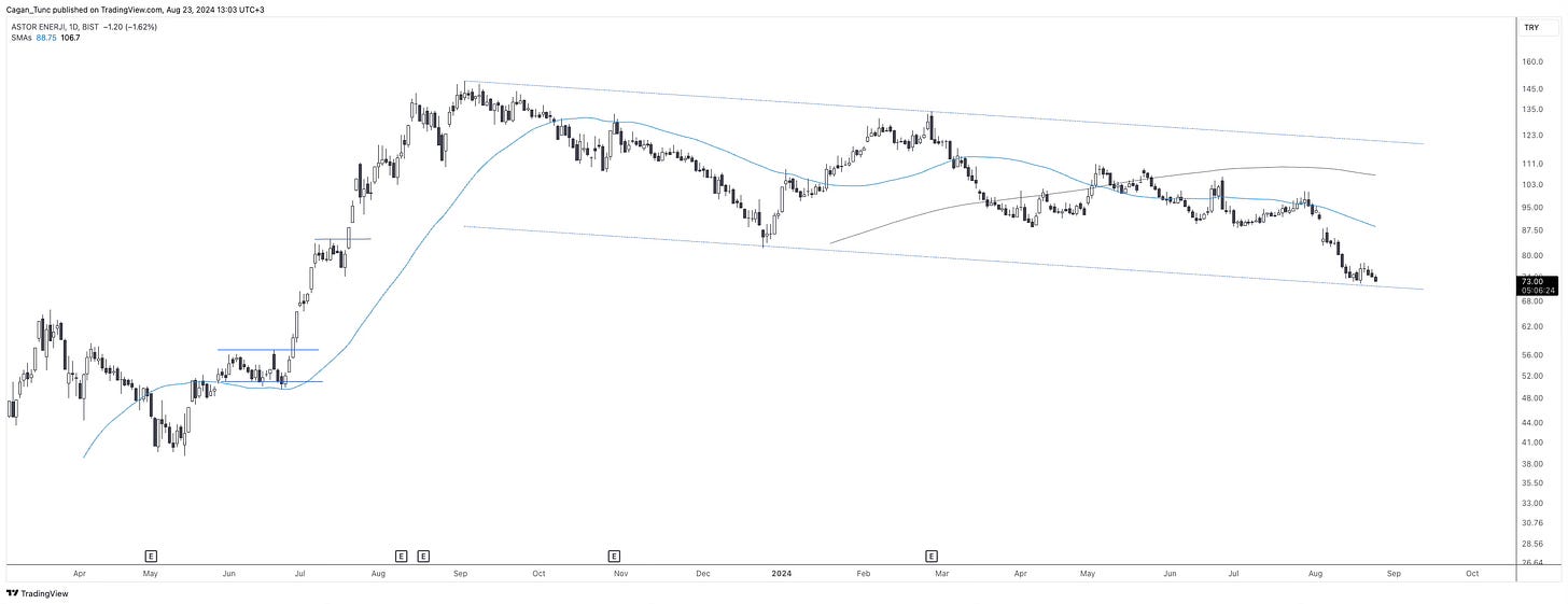#ASTOR - Ortalamaların altında fiyatlanan bu hisse senedinde kanal içerisinde düşüş trendi devam ediyor. Bugün için bir dönüş formasyonu gözlemlemiyoruz.