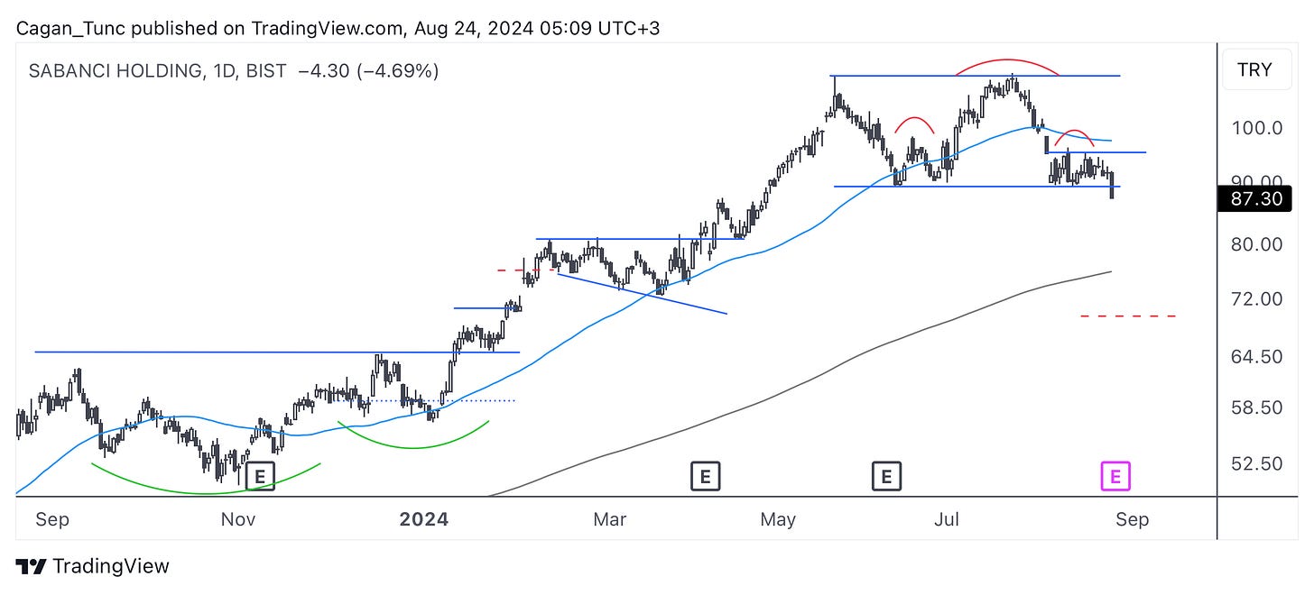 #SAHOL - Güçlü yükseliş trendi sonrası konsolidasyon sürecine giren hisse senedi, cuma kapanışı ile hem tepede oluşan dikdörtgeni hem de dikdörtgen içerisinde oluşan “OBO”yu aşağı yönlü kırmış görünüyor. Hisse ve endeks güçsüz kalmaya devam ederse fiyat uzun dönem ortalamaya doğru geri çekilebilir. Yukarı yönlü hareket için öncelikle fiyatın konsolidasyon bölgesine geri dönmesi ve sonrasında 50 günlük ortalamanın üzerine yerleşmesi gerekiyor.