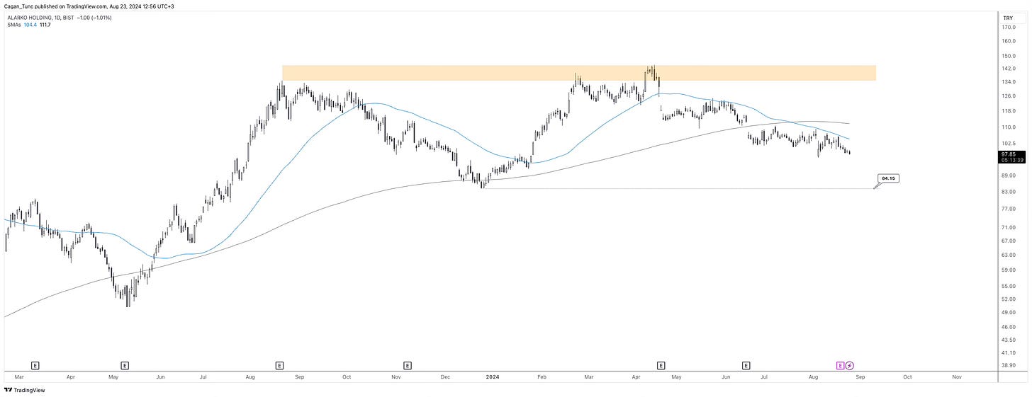 #ALARK - Ortalamaların altında fiyatlanan hisse senedinde düşüş trendi devam ediyor. 135-140 direnç bölgesini birçok kez denesede geçemeyen hisse için 84 önemli teknik destek. Yukarı yönlü momentum kazanabilmesi için önce ortalamaların üzerinde fiyatlanmaya başlaması gerekiyor. Bugün için bir dönüş formasyonu gözlemlemiyoruz.
