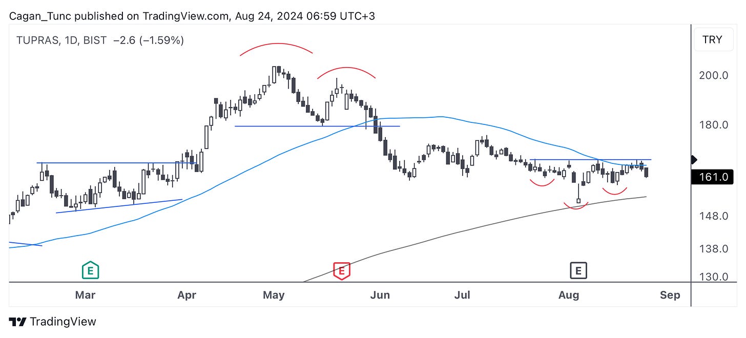 #TUPRS - Bir süredir dip arayışında olan ve 50 günlük ortalamanın baskısını kıramayam bu enstrumanda son günlerdeki hacim azalması dikkat çekici. Bir TOBO dönüş formasyonu oluşturma ihtimali olan bu hisse senedinde yukarı yönlü yeni bir hareket için önce 50 günlük ortalamanın sonra da boyun çizgisinin yukarı yönlü geçilmesi gerekiyor.
