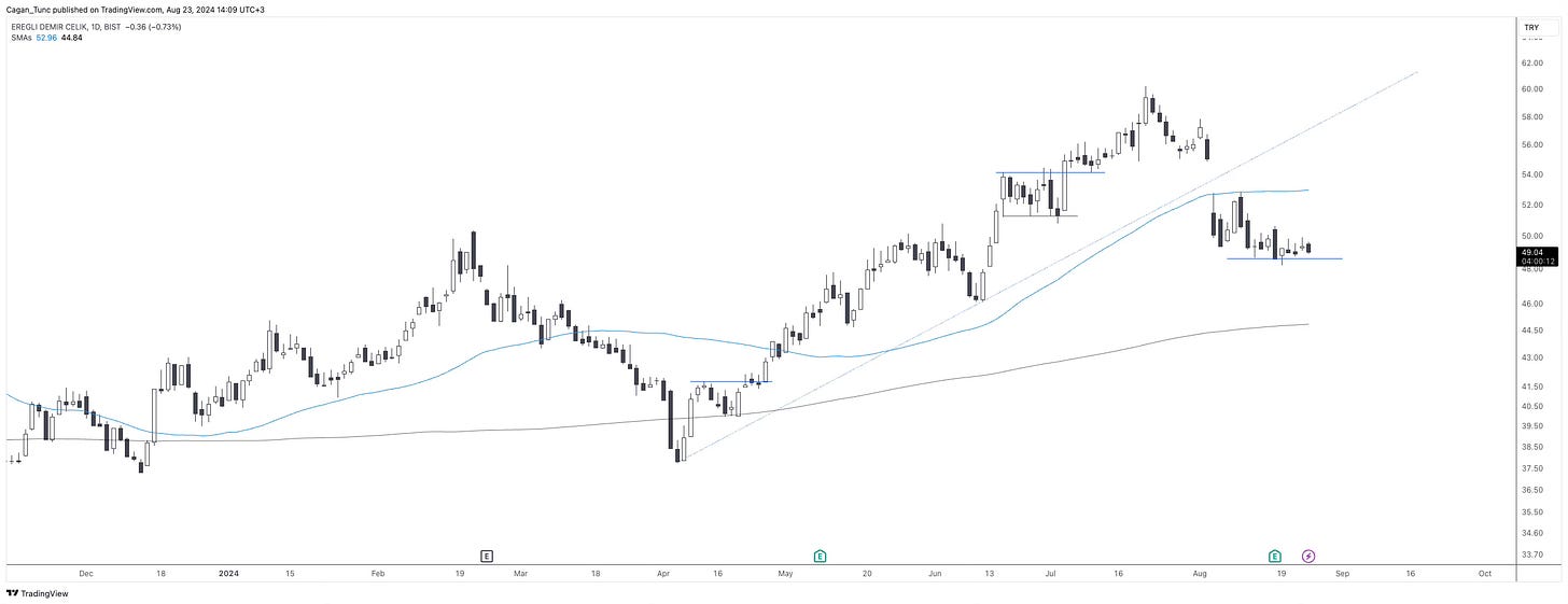 #EREGL - Düzeltme öncesi önemli bir ralli gerçekleştiren hisse senedi sert bir geri çekilme yaşadı. 50 günlük ortalamanın baskısını kıramayan hisse 48 seviyesinde destek buldu. Buranın aşağı kırılımı uzun dönem ortalamaya doğru çekilmeye sebep olabilir. Yukarı yönlü hareketlerde önce 50 günlük ortalamanın geçilmesi gerekiyor.