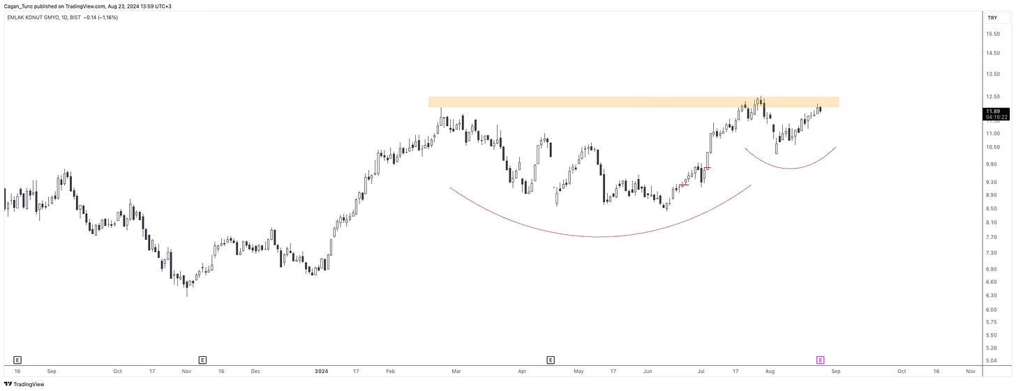#EKGYO - Düzeltme dönemini göreceli olarak daha güçlü geçiren bu hisse senedi, fincan-kulp formasyonu oluşturuyor. 12-12.5 direnç seviyesinin üzerinde kapanışlar gelmeye başlarsa yukarıda yeni bir oyun alanı açılabilir.