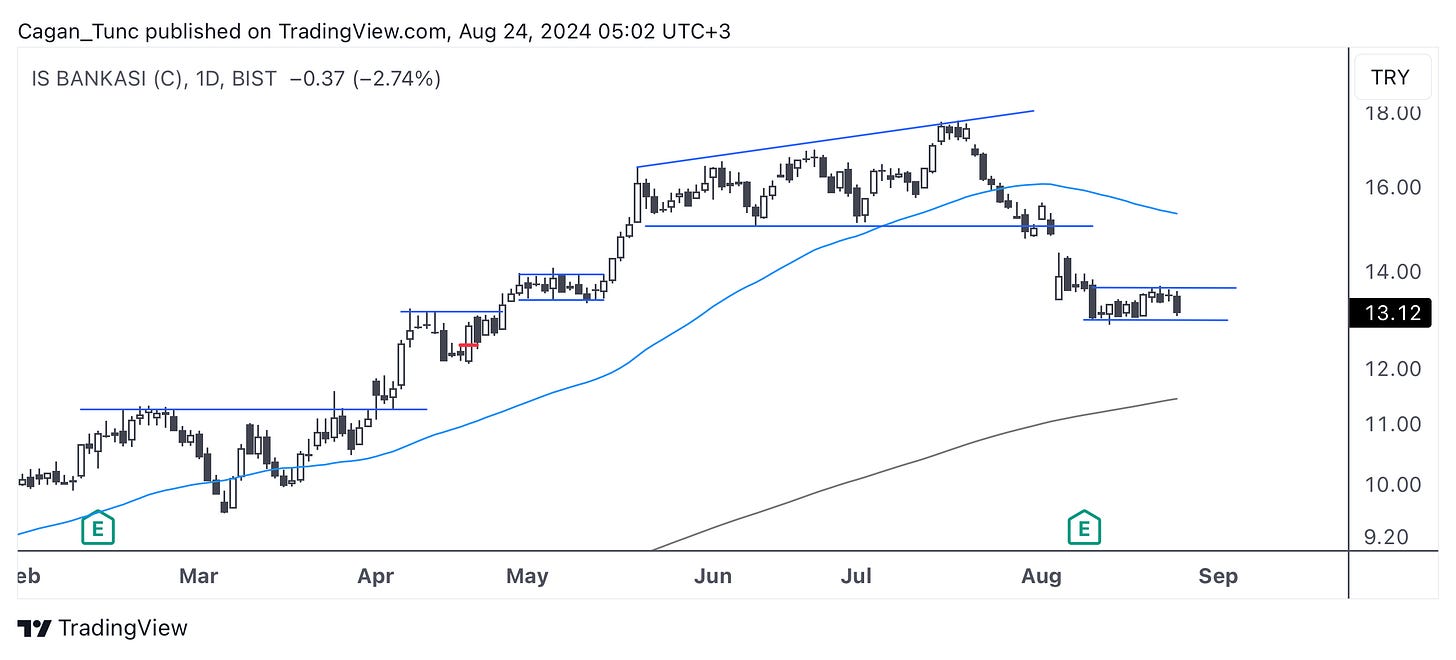 #ISCTR - Haziran 2024’den bu yana yeni tepeler yapmakta zorlanan bu hisse senedi, endeksinde zayıflamasıyla beraber güç kaybetti. 50 günlük ortalamanın altında fiyatlanan bu hissede 13 seviyesi destek olarak çalıştı. Bu seviyenin altına sarkmalarda uzun dönem ortalamaya doğru geri çekilmeler olabilir. Yukarı yönlü momentumlu bir hareket başlaması için öncelikle fiyatın 50 günlük ortalamanın üzerine yerleşmesi gerekiyor.