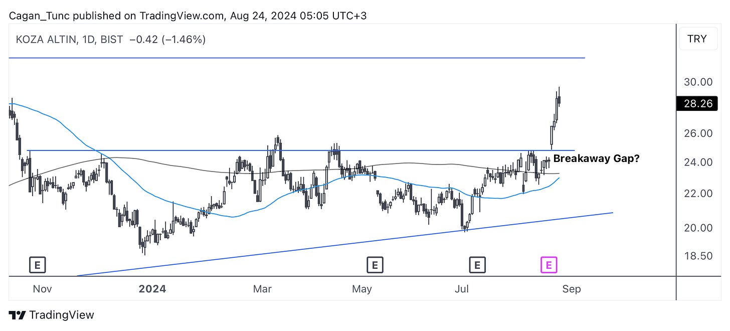 #KOZAL - Endeksteki düzeltme dönemi göreceli olarak güçlü geçiren bu hisse senedi 20 Ağustos günü “Break-away Gap” olarak yorumlayabileceğimiz önemli bir gap bıraktı. O günden beri momentumunu kaybetmeyen hisse direnç bölgesine yaklaşıyor. Bu bölgede satıcının gelmesi doğal olacaktır. Bu bölgenin de geçilmesi yukarıda geniş bir oyun alanı açacaktır.