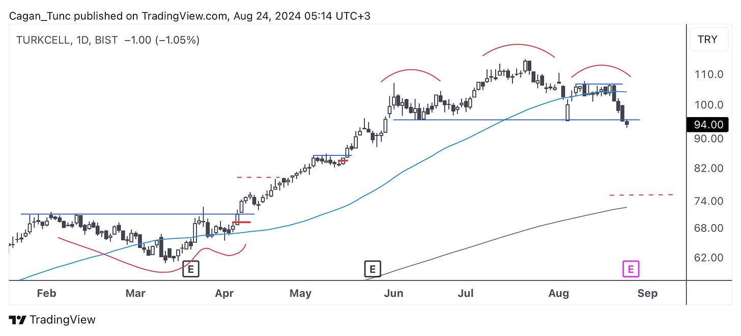 #TCELL - Önemli bir yükseliş trendi sonrası tepede bir OBO oluşumu izliyoruz. Boyun çizgisinin aşağı kırılımı bu hisse senedinin fiyatını uzun dönem ortalamaya doğru çekebilir. Cuma günkü hareketin devamı gelmez ve fiyat kendini tekrar formasyon içine atabilirse, yukarı yönlü hareketler için sağ omuz kırılımı takip edilebilir.
