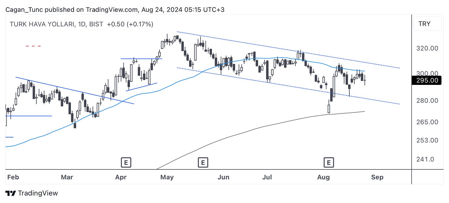 #THYAO - Endeksten önce düzeltmeye başlayan hisse senetlerinden biri olan THYAO, düşen kanal içerisindeki hareketine devam ediyor. Kanalı ihlal edip uzun dönem ortalamadan aldığı destekle tekrar kanal içerisine giren bu hissede 50 günlük ortalamanın baskısı hissediliyor. Bu baskıyı kırıp kanal dışına çıkabilirse hissede yeni bir hareket başlayabilir.