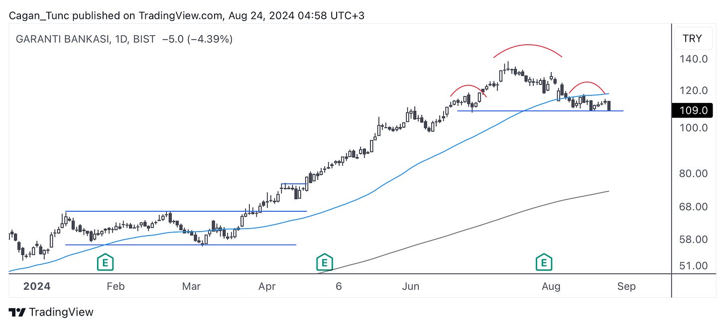 #GARAN - Son yükselişte bankalar arasında en iyi getiriyi sağlayan bu hisse senedinde tepede oluşan bir OBO görüntüsü var. Fiyat boyun çizgisinin üzerinde kritik bir seviyede oturuyor. Eğer aşağı kırılım gelirse hisse senedi uzun dönem ortalamaya doğru geri çekilebilir. Yukarı yönlü hareketlerde 50 günlük ortalama ilk direnç olarak karşımıza gelecek.