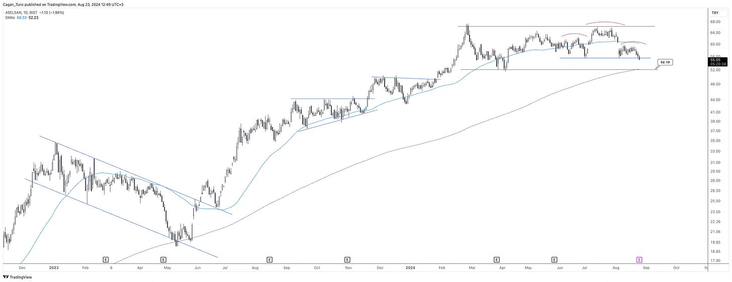 #ASELS - Yatay konsolidasyon süreci devam eden bu hisse senedinde oluşan bir OBO görüntüsü var. 52 hem önemli bir teknik destek hem de uzun dönemli ortalamanın bulunduğu seviye. 52 seviyesinin aşağı kırılması bir boy düşüş daha getirir. Sağ omuzun, 50 günlük ortalama ile beraber yukarı geçilmesi devam formasyonu olarak yorumlanabilir ve yukarı yönlü momentumu tetikleyecektir.