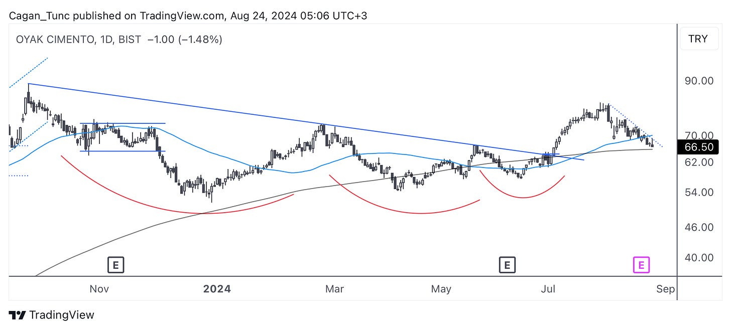 #OYAKC - Endeks düzeltmesi öncesi uzun dönemli düşen trendi kırıp bir ralli gerçekleştiren hisse senedi, geri çekilmeyle beraber neredeyse ralli başlangıç noktasına döndü. Uzun dönem ortalamanın üzerinde oturan bu hisse kısa vadeli düşen trendini kırıp, 50 günlük ortalama üzerine yerleşebilirse yukarı yönlü bir hareket başlatabilir. Şimdlik oluşan bir dönüş formasyonu yok.