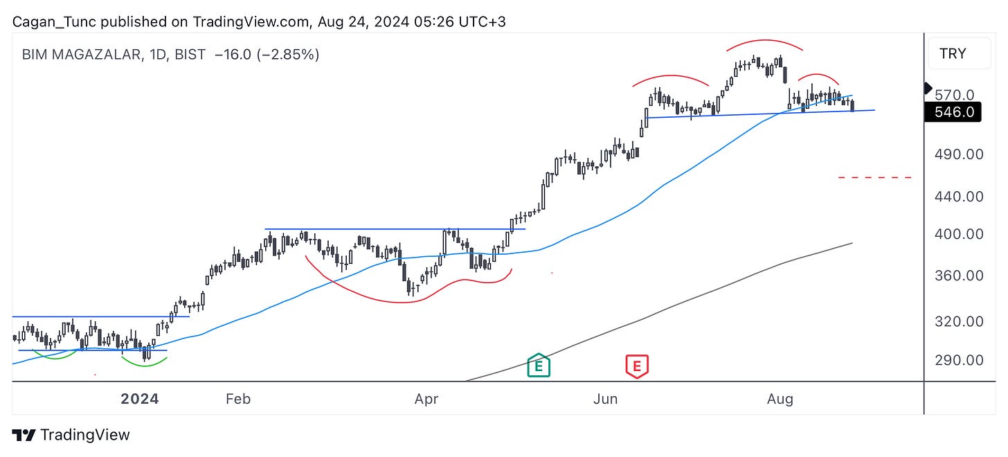 #BIMAS - Uzun süredir yükseliş trendi devam eden hisse senedinde net bir OBO görüntüsü var. Unutmayalım, tepelerde oluşan OBO formasyonu önemli bir dönüş formasyonu olduğu gibi sağ omuzun yukarı yönlü kırılımı devam formasyonu olarakta kullanılabilir. OBO formasyonu çalışırsa formasyon hedefi 460 seviyelerinde. Eğer sağ omuz yukarı yönlü geçilirse “OBO İptal” formasyonu olarak yorumlanabilir ve yukarı yönlü trend devam edecektir.