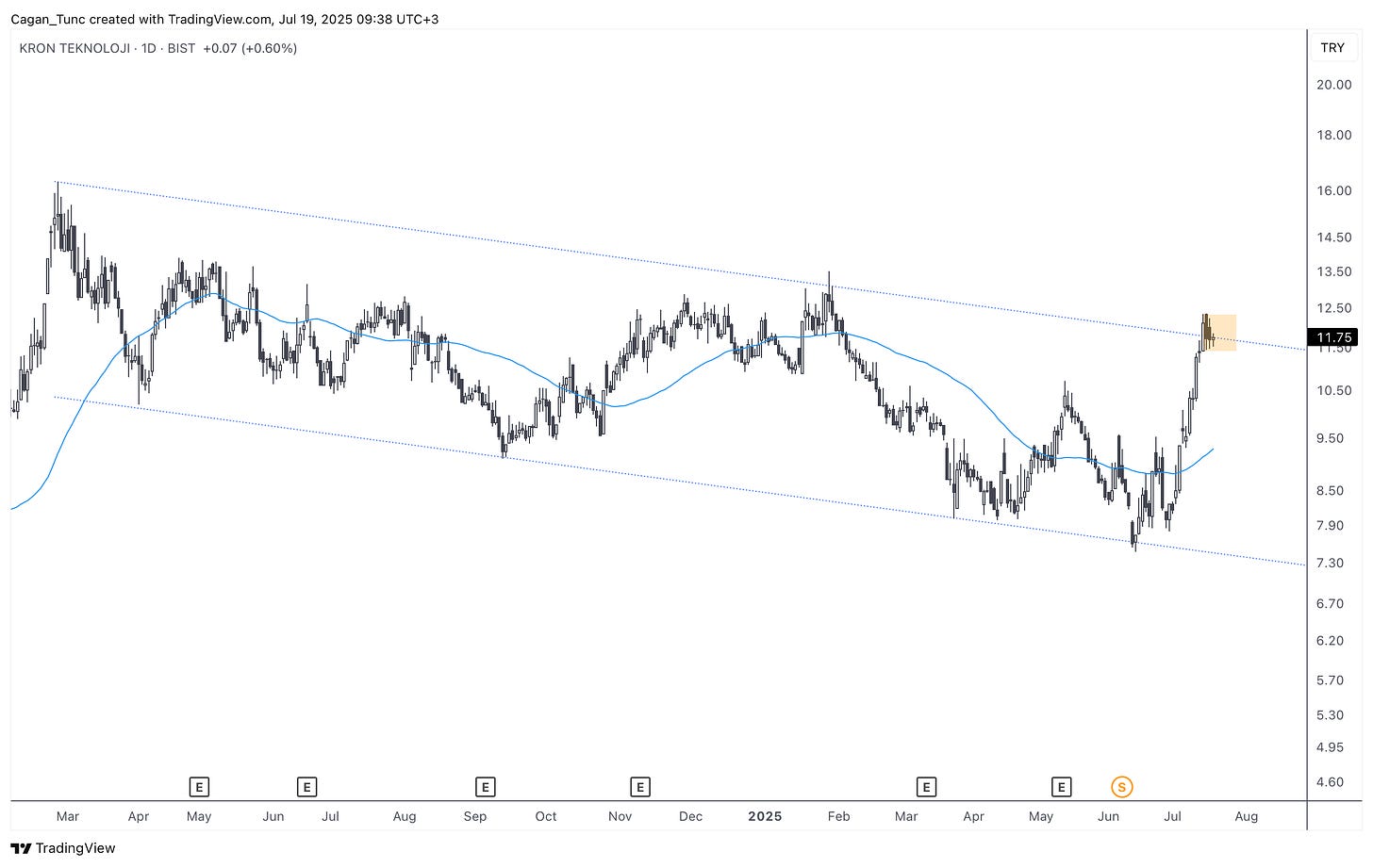 Uzun süredir içerisinde bulunduğu düşen kanal alt bandından destek bularak önemli bir yükseliş başlatan hisse senedi, kanal üst bandında dinleniyor. Turuncu ile gösterdiğim bölgeden hacimli bir mumla çıkabilirse yukarı yönlü hareket devam edebilir.